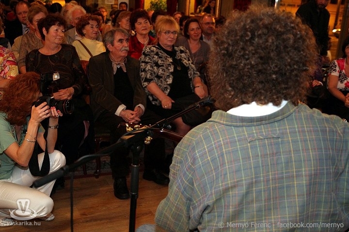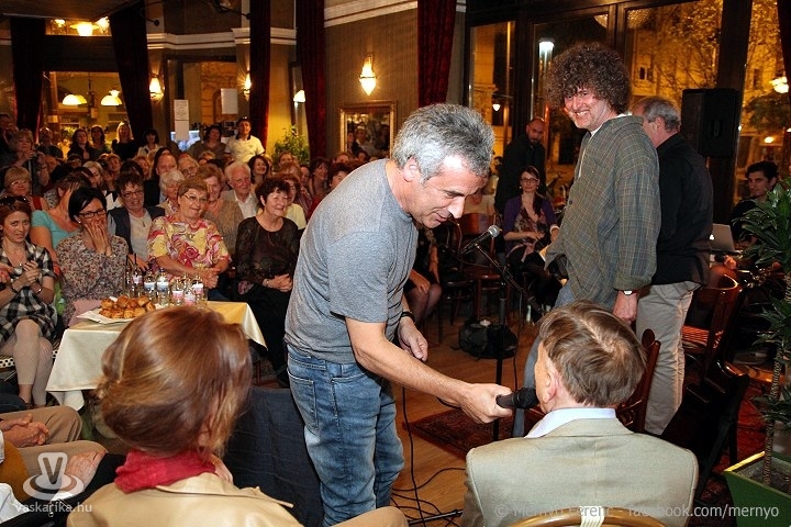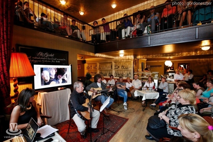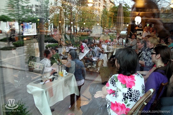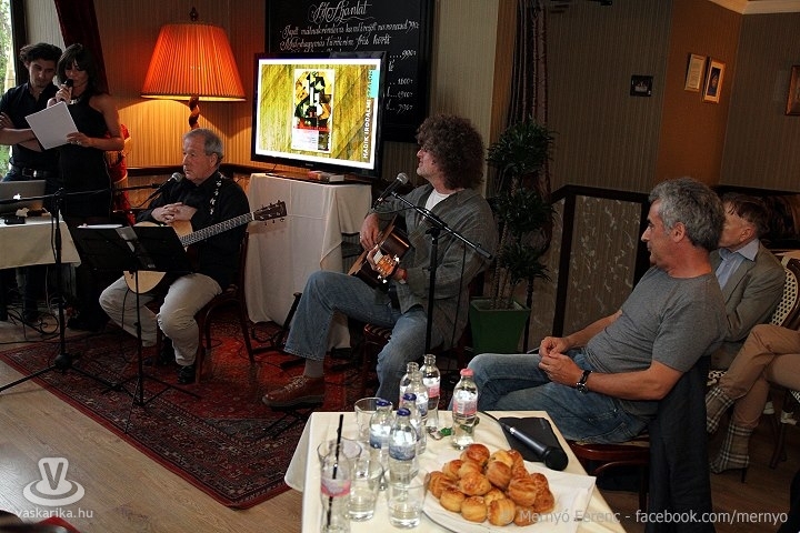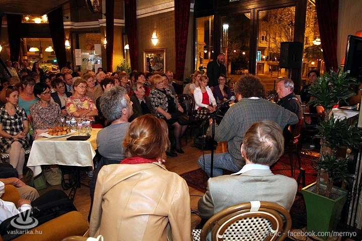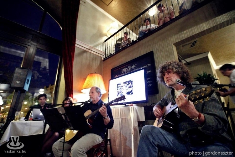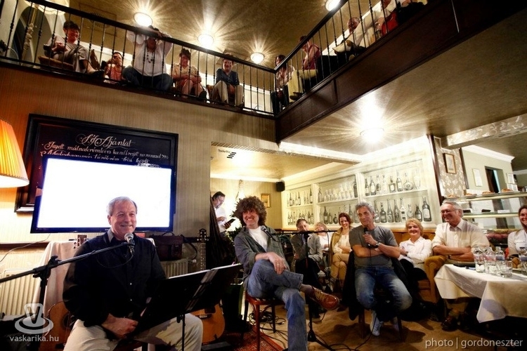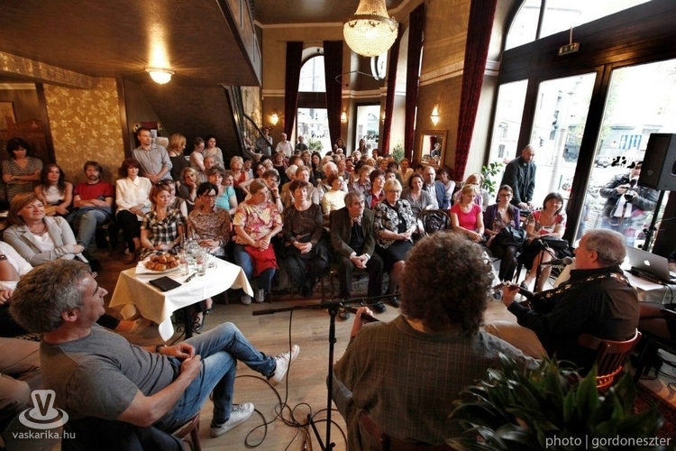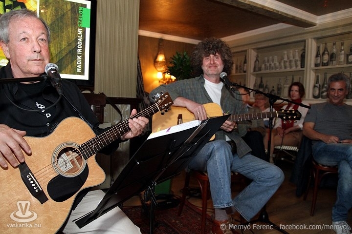 Az est legelején, majd legvégén a Vámos Miklós és Bornai Tibor alkotta Vámos Miklós Rock & Blues Band zenélt, igen nagy sikerrel. A beszélgetésben Vámos Miklós mesélt a gitározáshoz, a zenéléshez fűződő diákkori kapcsolatáról, majd arról, hogy tért be fiának kottatartót venni egy boltba tavaly, s látta meg a gyönyörű Fender gitárokat, majd hogy kezdte újra - fiával a gitározást. Vámos bevallottam írónak készült, már egész kiskorában történeteket mesélt családjának, ismerőseinek, újra és újra költve őket, ismételve, újrafogalmazva. 19 évesen jelent meg első novella-füzére az Új Írásban, amit számos kötet követett. Bornai Tibor Szegeden töltött gyermekkori élményeiről mesélt, s a háziasszony megidézett történetét folytatva arról a Szegedi Szabadtéri Aida előadásról, melyben etióp rabszolgagyereket alakított. Vámos Miklós kérésére elszavalta egy, a Hadik Kávéházban stílszerűen Karinthy Frigyeshez szóló versét: „Vegyünk, mondjuk engem, e verset szavalom, szám előtt mikrofon, lengetem a karom, mivel Micimackó, aki elbújt bennem, írt egy kis dalocskát, és most dúdolja fennen, néha, ágaskodva a szememből kiles, most már hol vagy, légy szíves, kedves Karinthy Frigyes?" (részlet a Kedves Karinthy Frigyes című versből)