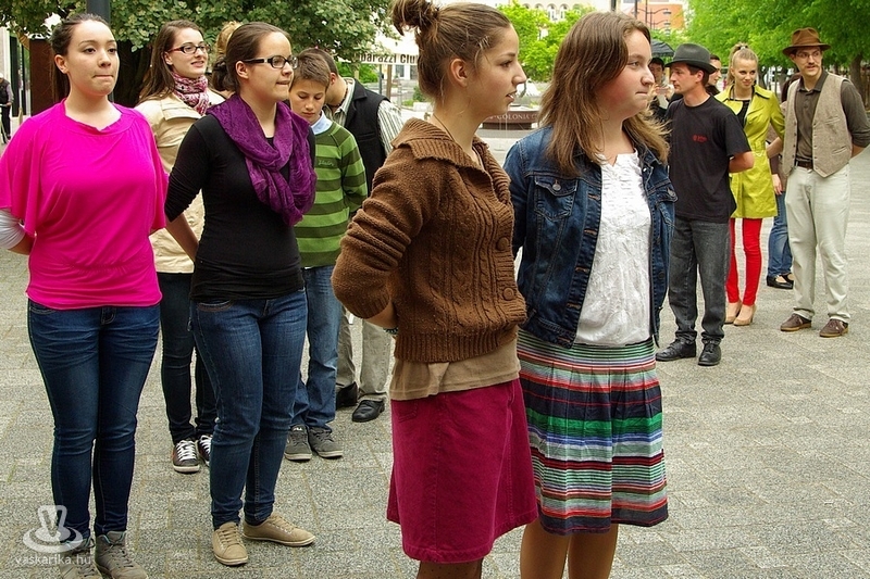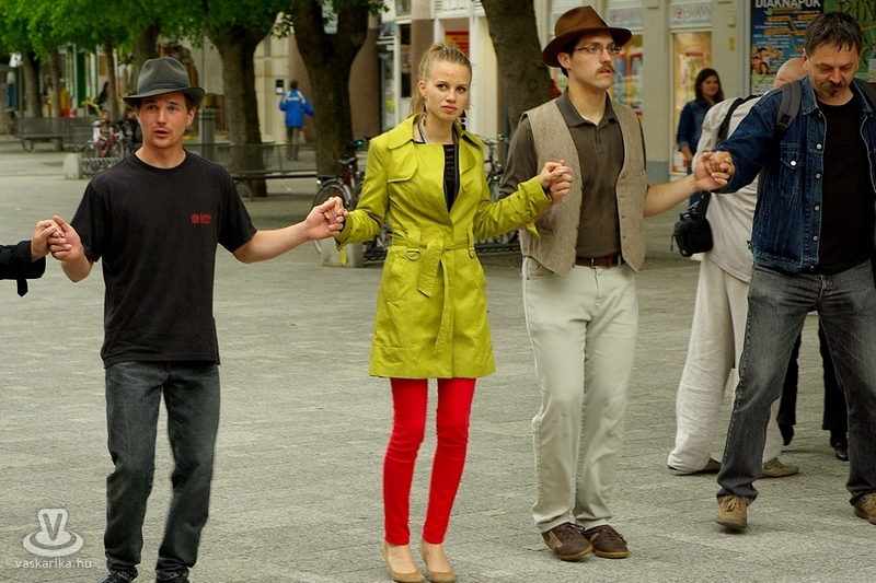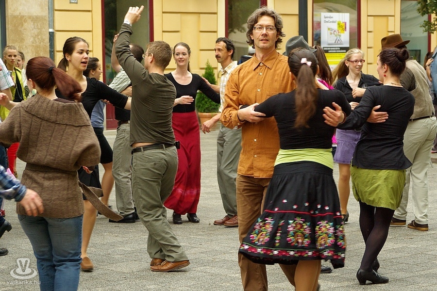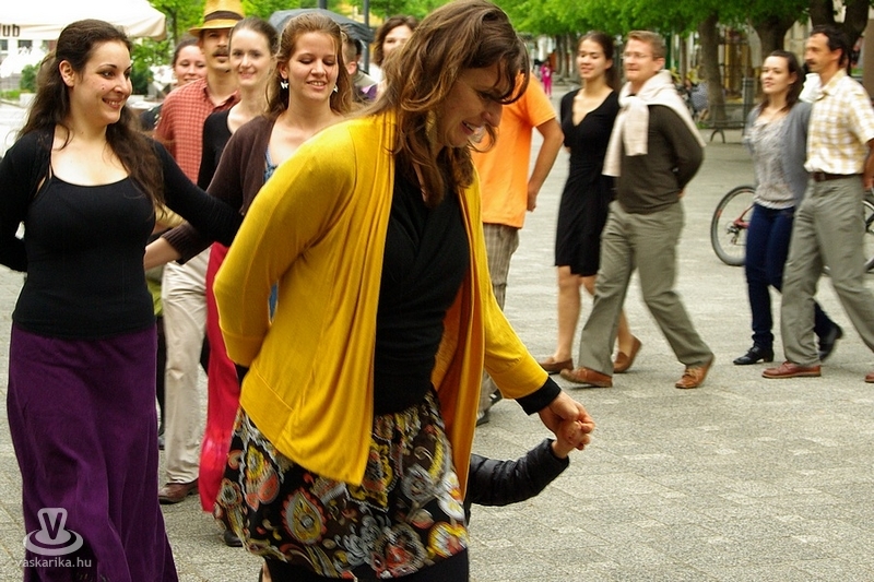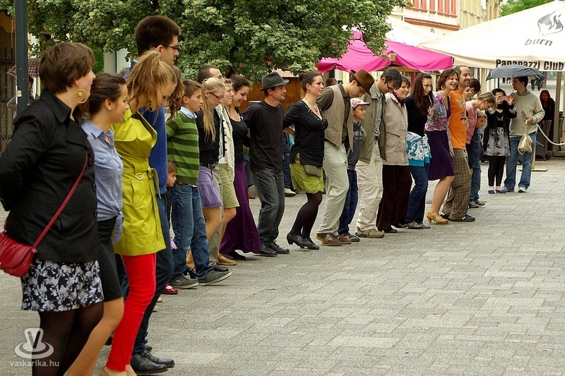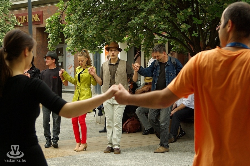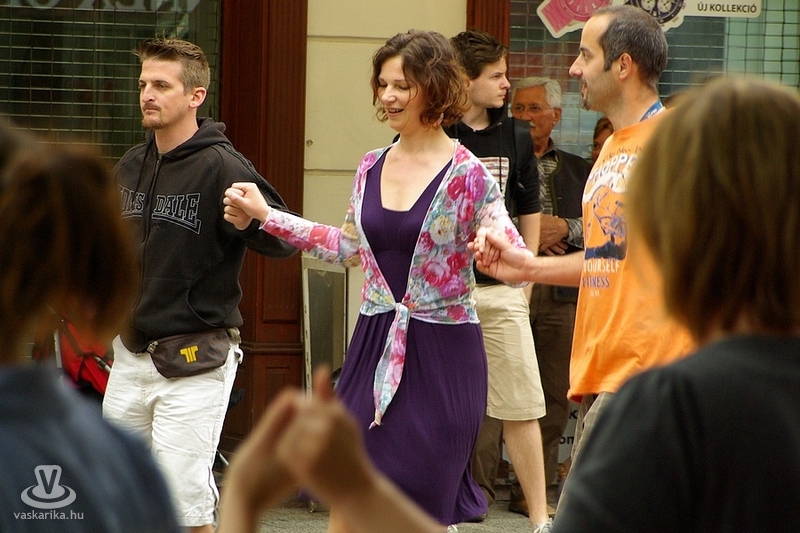 Sajnos a kezdés időpontja egybeesett az esőzés kezdetével, de láthatóan ez cseppet sem zavarta a Szökős Néptáncegyüttes tagjait. Az előzmények nélkül elkezdődő tánc meglepett járókelőket vonzott a helyszínre, akik percek múlva már aktív részesei lettek a táncháznak. A gondolat, amivel táncba csalogatták a járókelőket az volt, hogy nézelődve ázni sem jobb, mint ha tánctól folyik rólunk a víz. Így aztán pillanatok alatt meggyőzték az érkezők, akik perceken át együtt ropták a táncot a Szökőssel. A talpalávalót a Jurta Zenekar szolgáltatta.