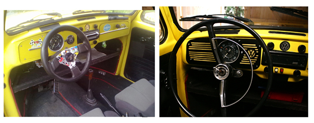 A korábbi műszerfalam sajnos nem tükrözte a VW bogár klasszikus vonásait, tehát úgy gondoltam, hogy cseréljük le a sárgára festett lemezdarabot valami másra. Nagyon másra. Először az eredeti grillrácsos állapotát szerettem volna visszaállíttatni, de aztán fordult bennem a gondolat, és kiötlöttem, hogy ne pazaroljuk el a bennem rejlő kreativitást és tervezői ambíciókat. Tervezőasztal mellé ültem, és megterveztem a saját, egyedi műszerfalamat. Sok-sok terv után megmaradtam a klasszikus vonalvezetés, de egyedi kivitelezésnél. A tervezési folyamatokban, a kivitelezésben és a megvalósításban kollégám és édesapám segédkezett. Viszont az új műszerfal mellé új kormány is dukált, így aztán a december végét kormányváltással ünnepeltem. Egy jó fajta wolfsburgi kürtkinyomóssal.