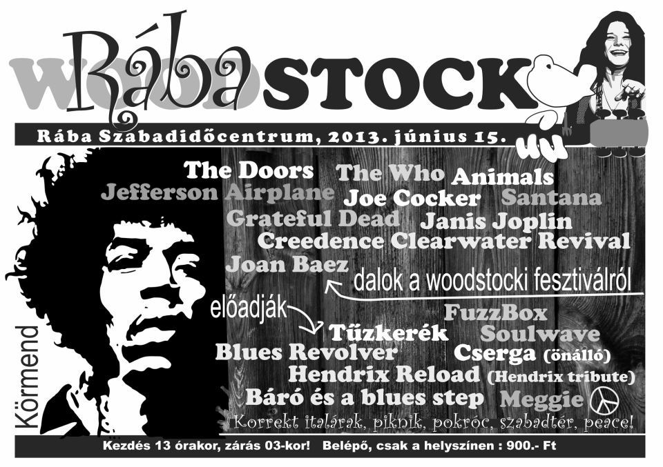 Sokan szóvá tették, hogy a plakáton szerepel az Animals és a Doors, akik természetesen nem léptek fel Woodstockban. Ne lepődjön meg senki, ha akár még Rolling Stonest is hall, mert ebbe a vonalba még jócskán beleférnek ezek a dalok. Ha a Rábastock elég sikeres lesz, ha van értelme és van igény rá, jövőre ezt is szeretném építeni már kétnaposra, ottalvósra, igazi feelinggel. Ezt majd a rendezvény után meglátjuk.