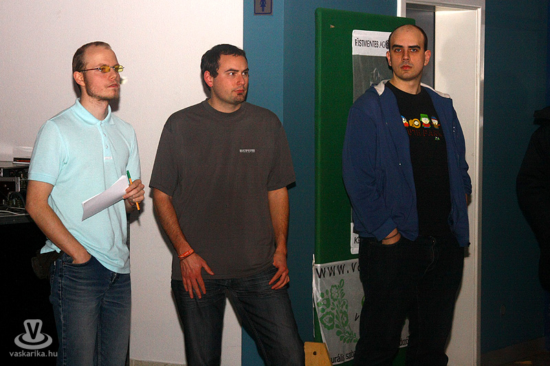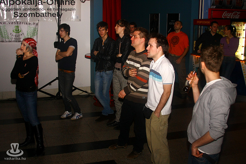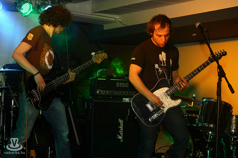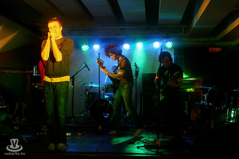 A színpadon, vagy éppenséggel próbateremben, a Shell Beach következett, és vicces volt látni, ahogy a második fellépő zenekarnak az első fellépő zenekar szolgáltat közönséget. Nem tudok sok mindent a nu-metálról, épp csak időnként nézek meg egy-két Incubus videót, azokat is csak azért, hogy láthassam az énekest, aki egy igazi félisten, no de maga a műfaj nem mond nekem sokat. Ugyanakkor a Shell Beach esetében megvolt a kötelezően üvöltő frontember, a kötelező mikrofon frizurás, és a kötelező „hülyesapkás" figura is. Laikus fülemnek minden úgy szólt, ahogy az egy műfajbeli zenekarhoz illik. A Jacked legénysége derekasan végig is hallgatta az előadást, és még némi fejrázásra, meg mutogatásra is futotta ebben a családi hangulatban. Az egyik dal végén ráadásul a zenekar már-már majdnem jazz közeli hangokat játszott, meg is lepődtem rendesen, bár az élmény nem tartott tovább néhány másodpercnél. Egy majdnem balladisztikus nótával végül elbúcsúztak Szombathelytől.