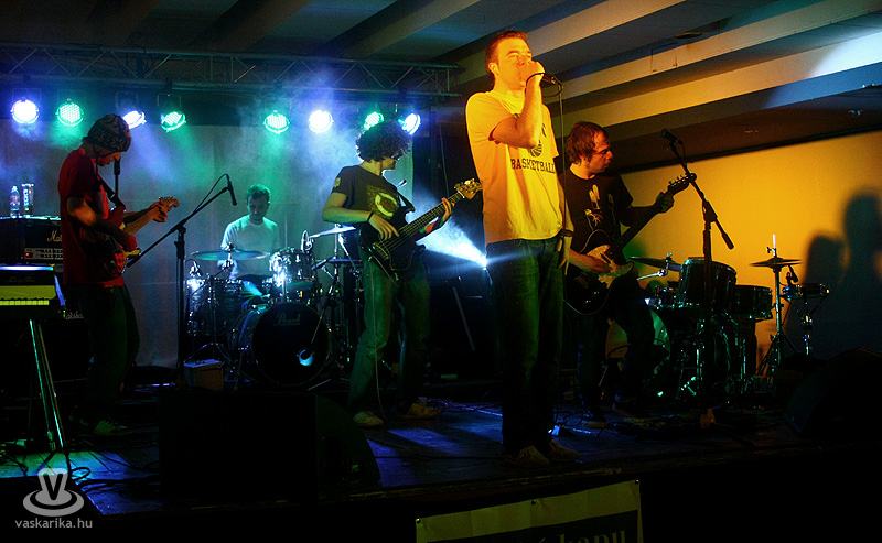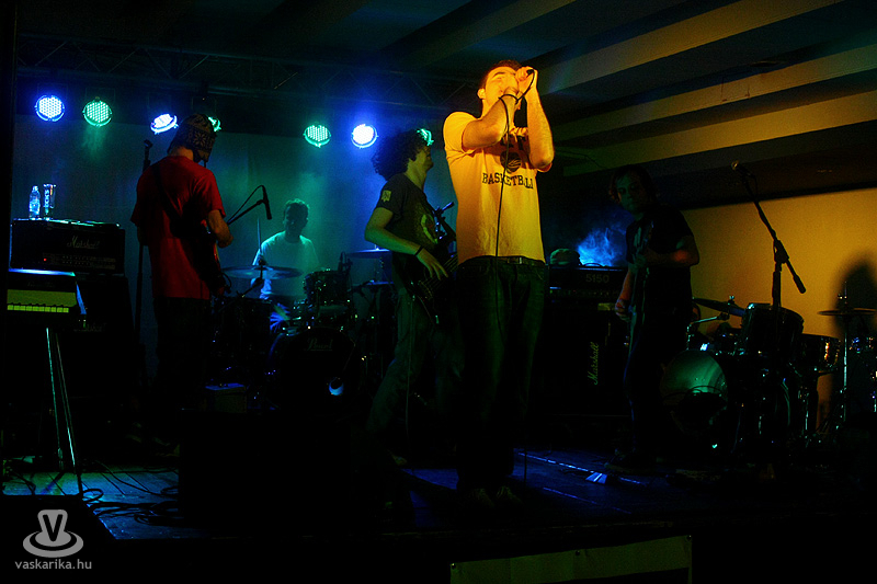 Jött még egy ember. Az est hangosításával semmilyen probléma nem volt, a hely adottságaihoz képest a fülem a helyén maradt. Egyébként ennek a minősége onnan mérhető le leginkább, hogy másnap ott köröznek a denevérek az ember feje körül -persze csak ha akarja- mert a fül olyan magas frekvenciát hallat. A hangolás izgalmas procedúrája totális ámulatba keltett minket, hiszen mikor az egyik gitáros megvakarta a fülét annak lézerpisztoly hangja volt, a dobos pedig döngölő hangot hallatott pedig csak ült a szerkója előtt. Biztos így fogja/szokta a kisgyerekét is elaltatni. Mindenesetre a profi hangcuccon a légypiszok földre hullása is ária lehetett volna. A Shell Beach azonban nem hagyta, hogy az, a mikrofonra érkezéssel lekenyerezze őket, a pillanat tört része alatt elkezdte aulaparti kagylómorajlását. Ahogy koncerthergelőnkben már megemlítettük a nyúlschool alter-hardcore zenekar el is hozta a 2007-ben megjelent Acronycal lemezborítós hardcore- reklámszatyrot. Volt is benne sok virgács. Hardcore énekesnek lenni nem könnyű feladat. Nehezebb, mint fizikusnak. Minimum 3 éves korban már el kell kezdeni az óbégatást, és ha felnő, 5 év alatt szerezhet OKJ-és képzést, persze a bukások,vagyis a félénk ordibálások és a túl érthető szavak miatt ez akár több évig is elhúzódhat. A kötelező irodalom Danielle Steel, A kis vakond és a Buci Maci magazinból áll össze. A gyakorlati tantárgy pedig a horrorfilmek alatti sipítozás. A vizsgák kemények általában egy lepusztult gyárépület kellős közepén történnek és egy 3 rétegű plexi üveget kell szétharsogni. Persze ha nem megy, egy 20 kilós kalapáccsal is lehet ütni, miközben énekel a vad, de akkor már csak hármas. Nem hiába mondják egy-két nótázóra, hogy ennek a gyereknek aztán pöröly a hangja!
