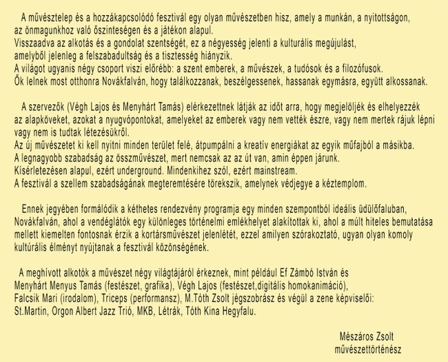 Egy fesztivál a szellem szabadságának megteremtésére - underground, mert kísérletezésen alapul, mainstream, mert mindenkihez szól. Novákfalván (Velem) május 31 - július 5-ig ingyen megtekinthető a rendhagyó programokat felvonultató esemény.