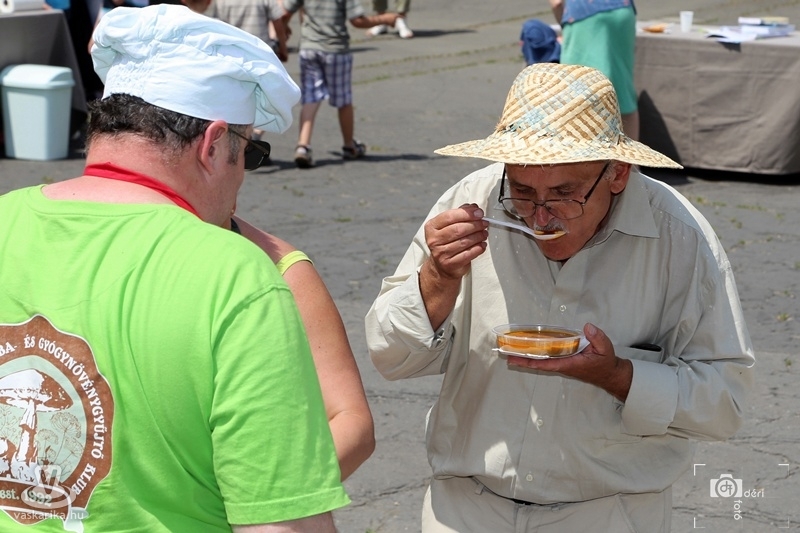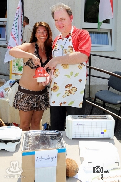 A rendezvény ideje alatt az udvaron a kicsik légvára mellett folyamatosan zajlottak a mozgás- és hastánc-bemutatók, animátor vezette vidám mozgások kicsiknek és nagyoknak, na és a szintén hatalmas népszerűségnek örvendő arcfestés. A programok közül igyekeztünk mind többet magunk is kipróbálni, mert ugye puding próbája az evés. Egy- egy gyermekeknek szóló mozgásprogram kezdetekor a légvárakat a nagyi-dédi korosztály is birtokba vehette és az infantilizmus máris az egekig szökhetett. (Megjegyezzük, hogy ez volt az általunk kipróbált legembertpróbálóbb, legnagyobb energiát követelő mozgásos tevékenység, nem kicsit melós dolog.) Ilyen körülmények között hamar meg is éhezett, szomjazott az ember. Az egészséges italok és ételek garmadája, igazi íz-orgia várta a bevállalós látogatót. Mi igyekeztünk mindent megkóstolni, legyen az ital, vagy mennyei étek, hiszen valóban azok voltak. A Gomba és Gyógynövény Klub ínyencségei - egy friss gombakiállítás kíséretében - közvetlenül az épület bejáratánál kaptak helyet. Ha akarta sem kerülhette volna el sem ember fia, sem leánya, és elismerjük hatalmas hiba is lett volna. De jártunk és kóstoltunk glutén-mentes finomságokat, zöldséglevet és kókuszzsíros kenyeret friss paradicsommal, lila hagymával.