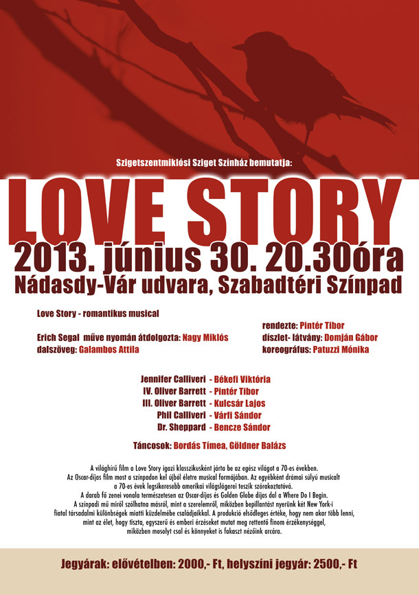 A világhírű film, a Love Story klasszikusként járta be az egész világot a '70-es években. Az Oscar-díjas mozi a színpadon kel új életre musical formájában. A darab tiszta, egyszerű emberi érzéseket mutat meg finom érzékenységgel, miközben mosolyt csal és könnyeket is fakaszt...