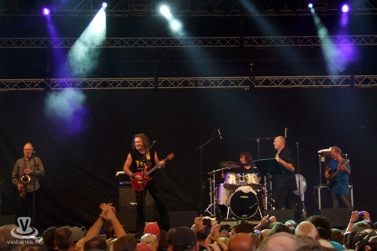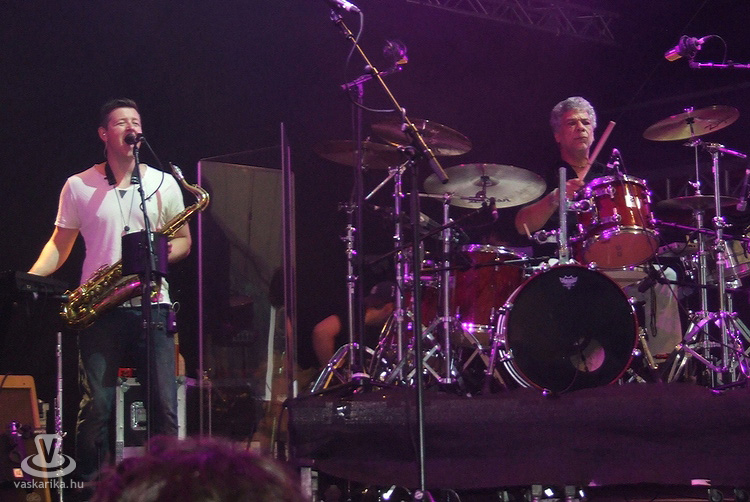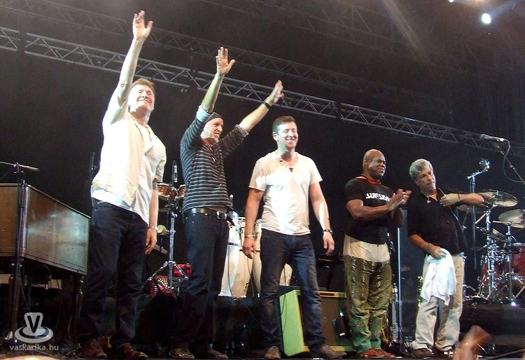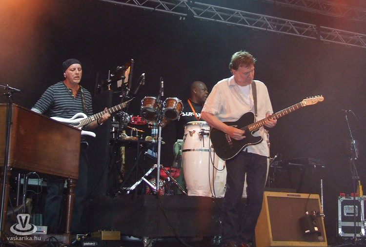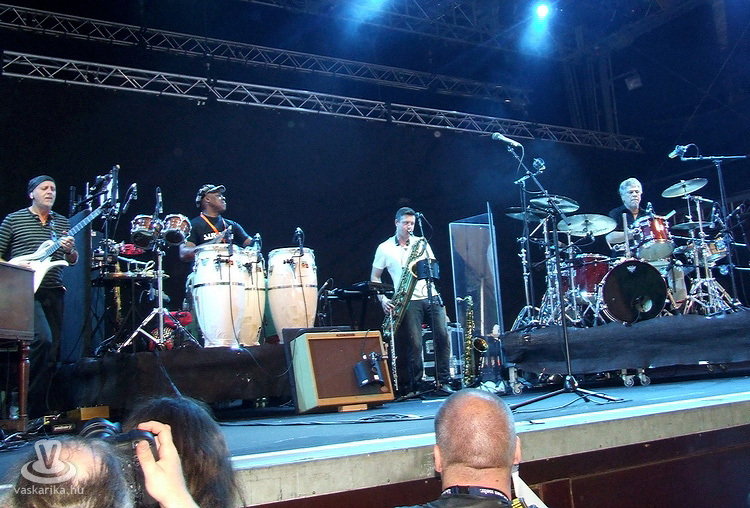 Utánuk jött többünk számára az est fénypontja, a 60-as, 70-es évek nagy brit blues-rock mestereinek máig aktív és termékeny énekese, orgonistája, gitárosa, Steve Winwood és csapatának bemutatkozása. Steve 1966-ban a rhythm & blues-t játszó Spencer Davis Group-ban kezdett, ott lett világhíres, majd 1968-ban az art-rock felé forduló Traffic együttesben, valamint a világ talán legnagyobb neveiből verbuválódott Blind Faith zenekarban érte el karrierje csúcsát. Mára két Grammy-díjat is magáénak tudhat az egykori csodagyerek-zenész. Azóta 10 albumot adott ki szólóban, és 65 éves kora ellenére napjainkban is folyamatosan turnézik. Öttagú bandájában latin a dobos, néger a bongós-kongás, és elmaradhatatlan a Jim Capaldi zenésztársa utódjául szegődő fuvolista- szaxofonos posztja, amit ezúttal a fiatal Paul Booth személyesített meg. Ő ugyanolyan méltó társa volt Steve-nek a koncert folyamán, mint a kalózkendős José Neto gitáros, aki, ha nem a főnők szólózott, átvette a rögtönzés jogát, mindannyiunk legnagyobb megelégedésére. A Rainmaker c. dalukkal kezdtek, és hiába sütött kint hétágra a nap, bizony a zene - csodával határos módon, a fuvolaszólónak köszönhetően - a borongós esőt idézte meg a színpadon.