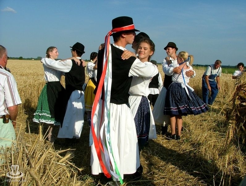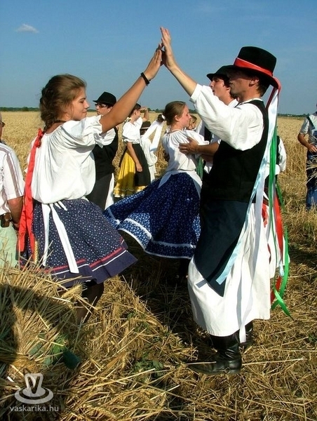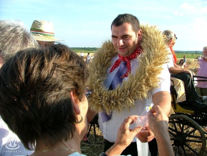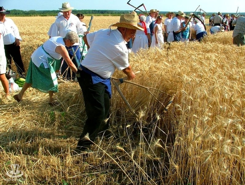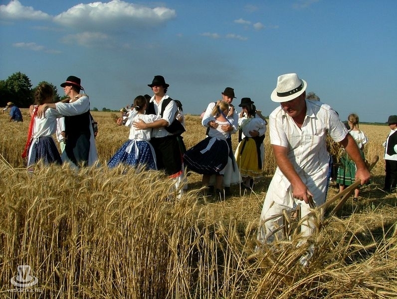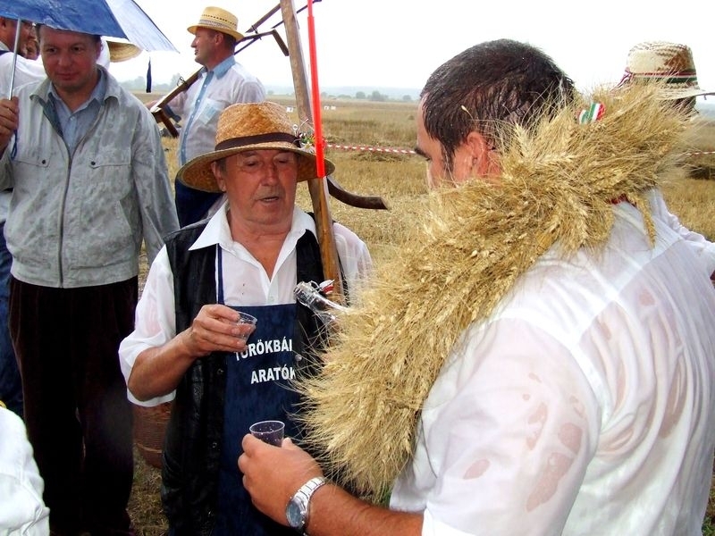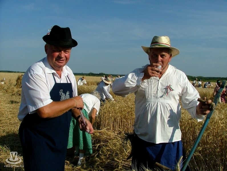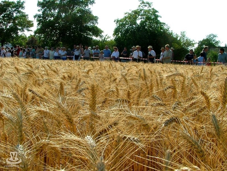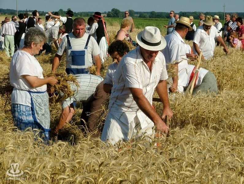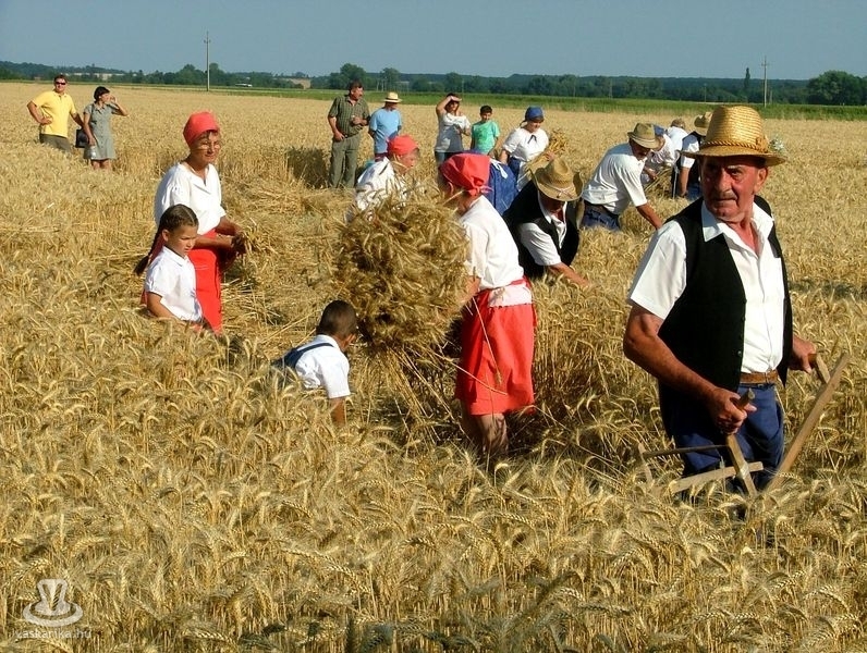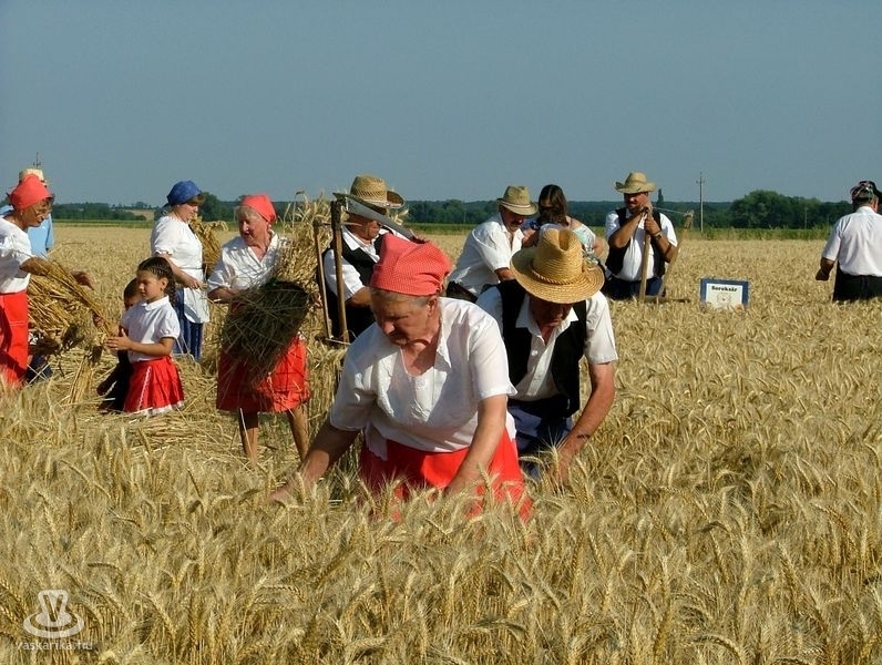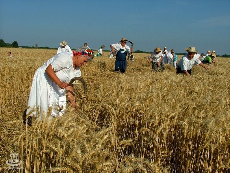 Az aratóbandák a művelődési háztól vonultak - szokás szerint - a fürdő parkolója melletti búzamezőre. Itt a kézikaszás férfiak és a marokszedő asszonyok megmutatták, hogy a múlt század közepéig hogyan történt az aratás, a kéveszedés.