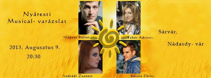 A 'Színházi esték a várudvaron' programsorozat keretén belül ezúttal egy különlegességgel kedveskedünk a városiaknak, és az itt pihenőknek. Augusztus 9-én este 4 fiatal művész fogja csodálatos hangjával betölteni a Nádasdy-vár udvarát. Részletek hangzanak el olyan híres musicalekből, mint az Elisabeth, az Operaház fantomja, Mozart, Rebecca, Padlás vagy a Rómeó és Júlia. Azonban nem csak ebben a műfajban jeleskednek a fellépőink.