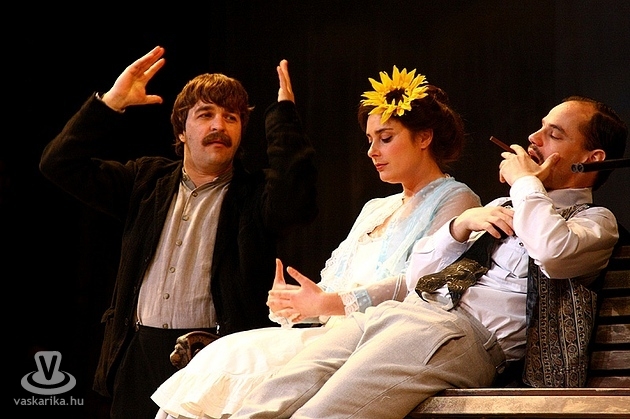 | Orosz Róbert, Bálint Éva és Vass Szilárd a darab egyik jelenetében - Cseresznyéskert-premier a WSSZ-ben |