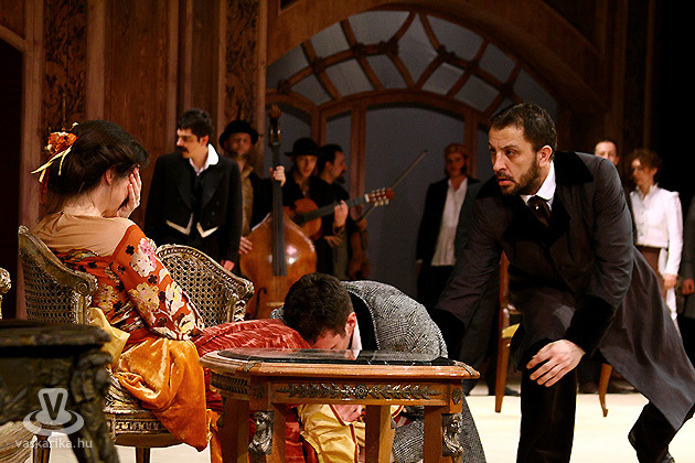 | Lopahin (Czapkó Antal, középen) vette meg a Cseresznyéskertet - Tóth Ildikó és Endrődy Krisztián a jelenetben |