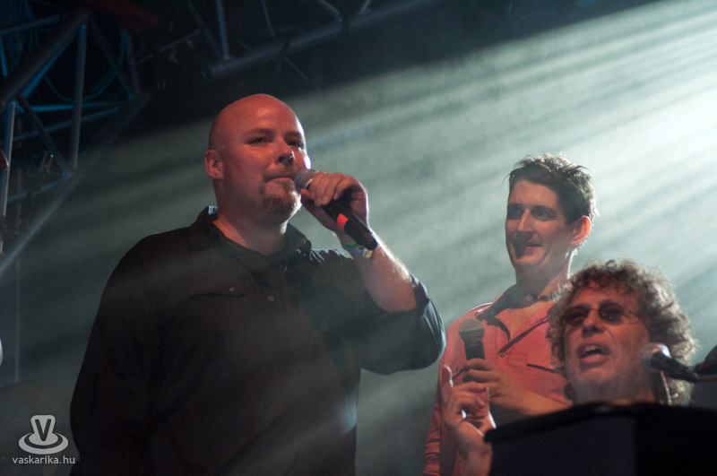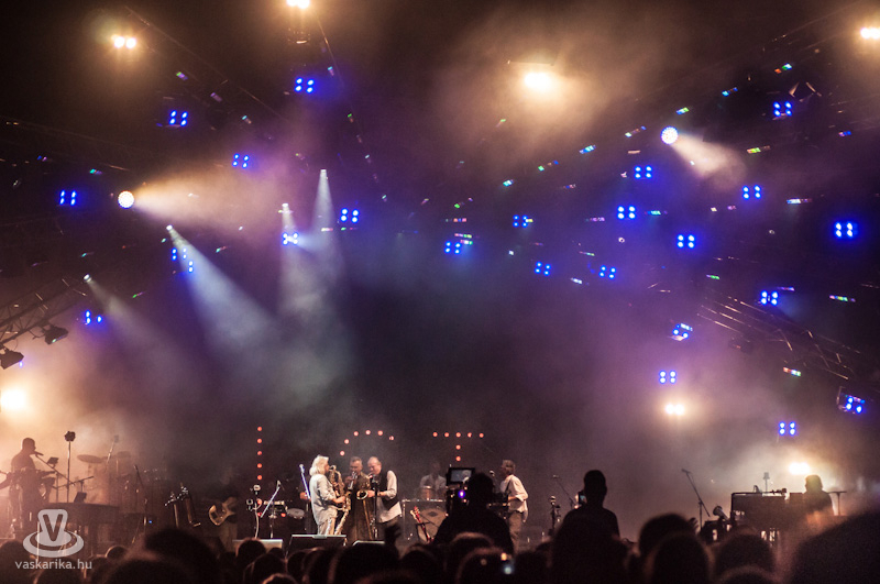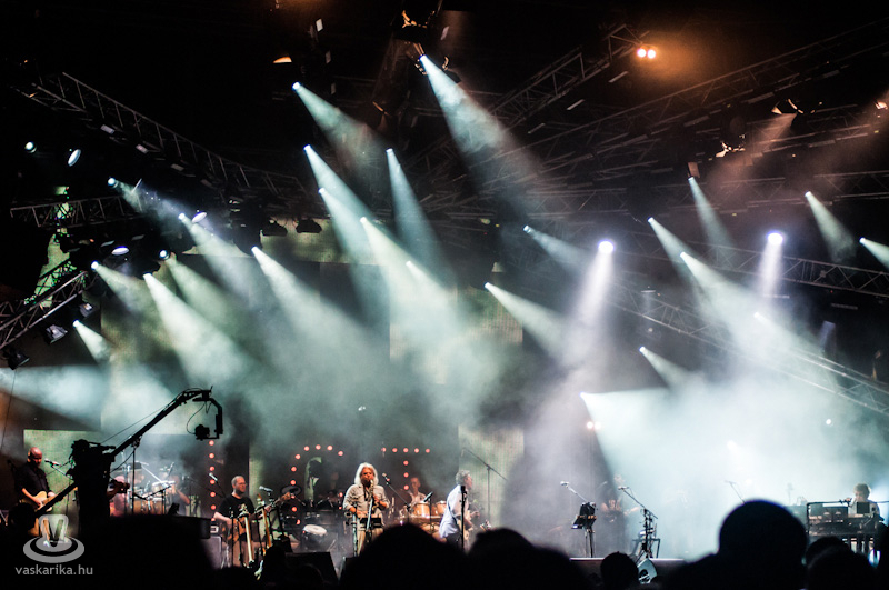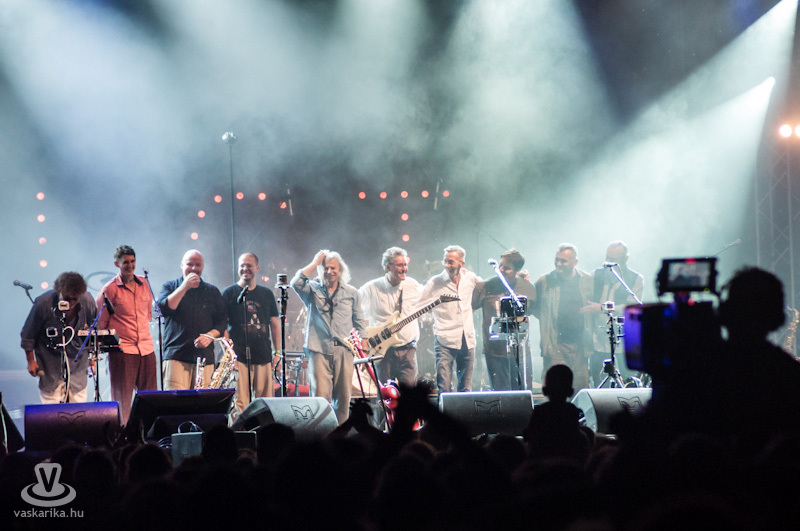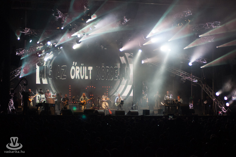 Este 8 körül beindult a dübörgés. A területet félelmetes méretű tömeg foglalta el. Felzúgtak az első akkordok - persze CD minőségben - a hozzájuk illő városnyi fényekkel. Sorra jöttek a régi slágerek, „mind ott voltunk a síneken", kiszámoltuk a boksz meccsen az ellenfelünket és „mindenki szerette a jó zenét". Somló Tamás felvonultatta a létező összes fúvós hangszert, Karácsony János pedig srác korát idézve tépte a húrokat. Őt külön ünnepeltük, hiszen a napokban töltötte be a 62-t.