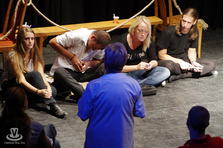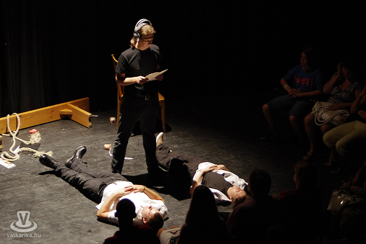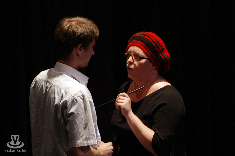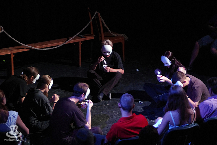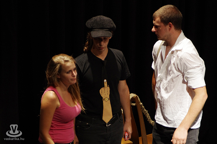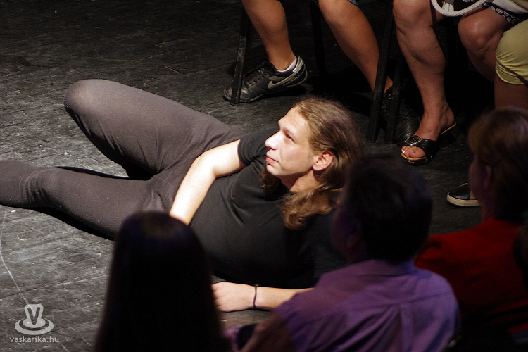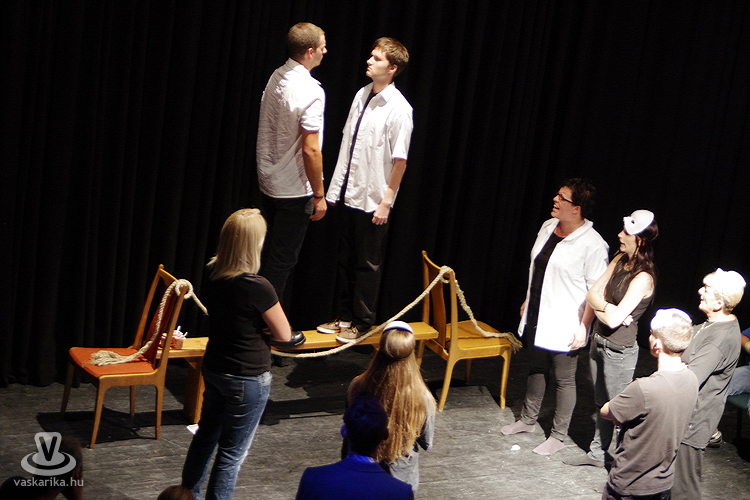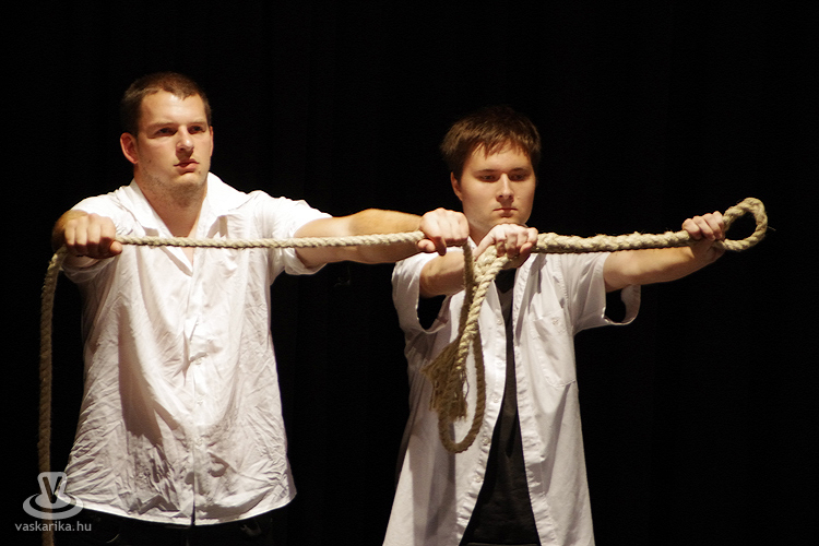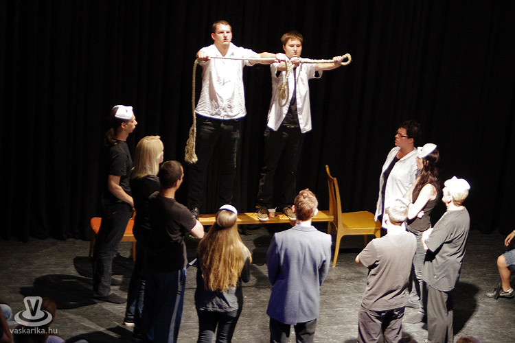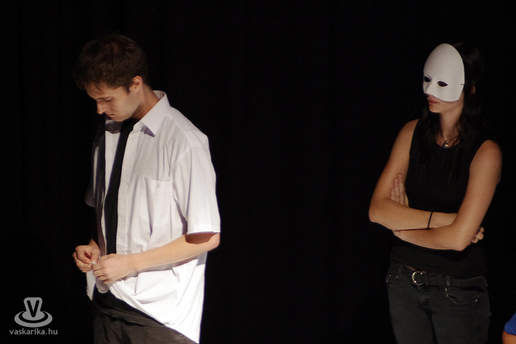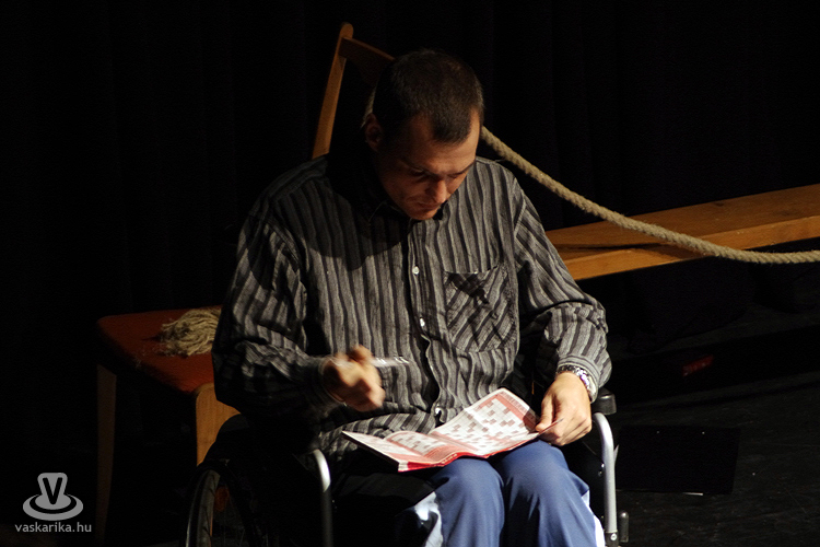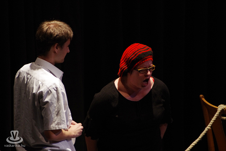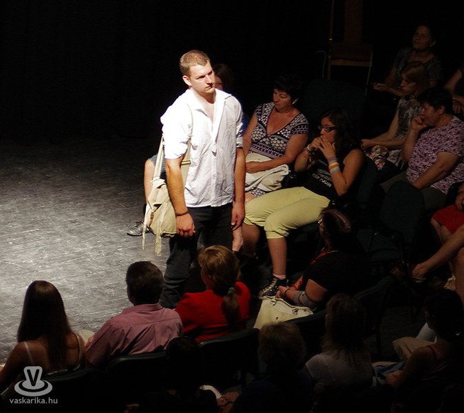 A vasvári „Üss a hasadra!” Színpad „Pilonon” című hídkomédiájára hívta közönségét a Nagy Gáspár Kulturális Központba. A Kiss Márton által papírra vetett előadás mozaikszerűen ábrázolja egy kisfiú történetét, felerősítve egy-egy mozaikot a megélés szempontjából. Mi határozhatja meg sorsunkat? Az első önálló vásárlás, az első udvarlás, vagy a diploma megszerzése, az első munkahely, esetleg egy iskolai tanóra? Mindeközben milyen gondolatok fogalmazódnak meg bennünk az élettel kapcsolatban? Ezekre kereste a választ az előadás időben és térben kalandozva, a híd szimbolikájával, amit erős pillérek tartanak, s amiről mégis a legkönnyebb múltba és jövőbe merengeni, és amiről letekintve húz minket a mélység, és ami alatt a víz sodrása az élet sodrása is egyben… A díszlet egyszerű: két szék, egy pad, egy kötél, a kíséret pedig egy-egy hang egy zongorán. Az előadás az idei esztendőben bronz minősítést kapott a vasvári Színjátszó Fesztiválon, és elnyerte Keszthelyen a legjobb rendezés díját.