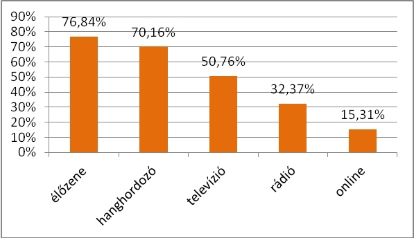 Két olyan zene-felhasználási csatorna van, ahol az elmúlt években alig változott a magyar zene aránya. A televíziós csatornákon 51 százalék körül hallhatunk hazai muzsikát, az élőzene területén pedig szokás szerint igen magas, 77 százalékos a magyar zenei alkotások szerepe.