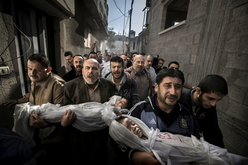 Az idei évben Vezető hír kategóriában első díjat nyert fotón a kétéves Suhaib Hijazi és bátyja, a négyéves Muhammad holttestét viszik rokonaik a temetésükre Gaza Cityben. A gyerekek a november 19-i izraeli légicsapások közben haltak meg, amikor a család háza összeomlott. A bombázásban apjuk, Fouad is meghalt, anyjuk és négy további testvérük pedig súlyosan megsebesült. Izrael november 14-én indított támadást a Hamasz ellenőrzése alatt álló Gázai övezet ellen válaszként a palesztin fegyveres csoportok folyamatos rakétatüzére. A támadás első napjaiban Izrael katonai és stratégiai jelentőségű célpontokra csapott le, a művelet aztán később kiterjedt a Hamasz harcosok feltételezett lakóhelyére is. A november 21-i tűzszünet idejére már több mint 150 embert öltek meg Gázában. A halálos áldozatok közül a feltételezések szerint 103 polgári áldozat volt, köztük legalább 30 gyerek.