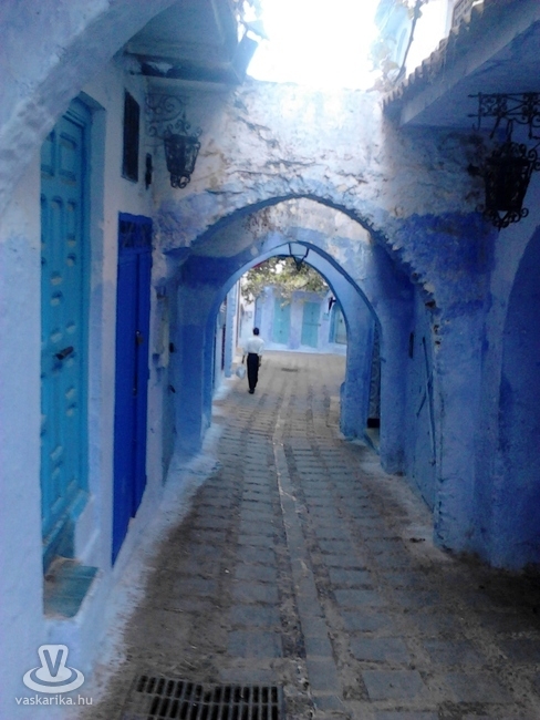 Chefchaouen utcáin a végtelenségig lehet sétálni, belesni a kis üzletekbe, a cipészekhez, szabókhoz, rézművesekhez, megcsodálni a kékre festett veretes ajtókat, a cizellált ajtókopogtatókat, hallgatni a müezzin hangját, rácsodálkozni a kis kávéházak előtt ülő, békésen mentateát szürcsölgető férfiakra. Este, kikeveredve a sikátorokból, a kasbah melletti gyönyörűen megvilágított téren elfogyasztottuk életünk első tajin vacsoráját és mentateáját, a sok kóbor macska kíváncsi pillantásának kereszttüzében...