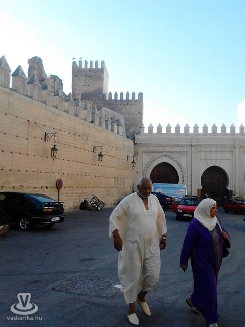 Délután a Fez-el-Djidbe látogattunk el, gyalogosan. A két óváros közötti távolság negyedóra alatt megtehető. Fez-el-Djid lényegében az új Fez, ez főleg azért mulatságos, mert egy 700 éves városrészről van szó. Itt található a király palotája, és itt a palota csodálatos kapuját is le lehetett fényképezni a korábbiakkal ellentétben. Ez a városrész is tele van bazárokkal, illat- és színkavalkáddal, de nekem úgy tűnt, hogy kevesebb turistával lehetett itt találkozni. Felkapaszkodtunk a kasbahhoz, amelynek csipkézett falain rengeteg gólya tanyázott.