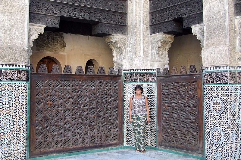 Olykor hozzácsapódtunk egy-egy turistacsoporthoz, gondolván, az idegenvezetőjük tudja a jó irányt, de lényegében sikerült mindent egyedül felkeresnünk, amit szerettünk volna. Még olyan látnivalókat is, amelyek csak úgy felbukkantak előttünk véletlenszerűen. Ilyen volt a bájos Place es-Seffarine, ahol rézművesek műhelyei-boltjai voltak, valamint a romos állapota miatt nem látogatható Medersa (egyetem) Seffarine. A teret az ütemes kopácsolás hangja töltötte be, a kis üzletekben szebbnél szebb rézlámpákat árusítottak. Fezben kötelező látnivaló a Bou Inaria Medersa, a régi korániskola, a fafaragók közponja, a Nejjarine-tér, a Karaouiyine- mecset, és az El Attarin Medersa. A Bab Bou Jeloud kaputól negyedórás sétával a Merinida- dinasztia sírjai is elérhetők a dombtetőn. Aki szép kerámiát szeretne hazavinni, azt mindenképpen itt, Fezben vegye meg: ez Marokkó „Herendje".