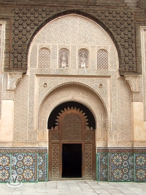 Ha végig a fő utcákon haladunk, a Place de Ben Youssef-re érünk ki, ahol rögtön három nevezetesség is található: a Ben Youssef medressza (egyetem), a Marrakesh múzeum, valamint a Koubba el Baroudlyn szentély, amelyet az Almoravid-dinasztia építetett a 12. században. A legjelentősebb és legszebb műemlék a három közül az ország legnagyobb iszlám teológiai iskolájának épülete, amelyet rendkívül szép cédrusfa és kőfaragás valamint mozaikcsempe díszít. Mivel az iszlám előírásai alapján élőlényeket ábrázolni nem szabad, a faragásokon növényi és geometriai minták az uralkodóak, mint mindenhol Marokkóban. Az emeleten találhatóak az egykori diákok szobái, amelyek közül kettő berendezett, az egyik egy egykori szegény, a másik egy jómódú tanuló életterét mutatja be.