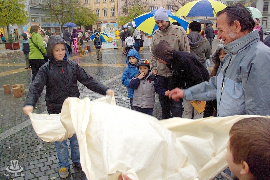 Másnap sok gyerek kedvence, a Márton-napi kirakó jól indult, de végül a ruhák is eláztak, és a libák is inkább úszva távoztak az eső áztatta Fő térről. Sok gyerektől, illetve szüleiktől hallottuk, hogy mennyit emlegették a gyerekek, s mennyire várták ezt a pecsétgyűjtő, ügyességi játékot, amit nagy népszerűséggel az Agora Gyermekek Háza szervez a Szent Márton Ünnep alkalmából. Voltak már zord időszakai ennek a rendezvénynek: hatalmas köd, idejéhez képest korai, kemény hideg, kisebb eső, de sem az egyes állomások játékvezetőit, sem az záróműsor, a néptáncbemutató résztvevőit nem tudták ezek eltántorítani. Most viszont hiába a sok érdeklődő és résztvevő, a kitartó, nagy mennyiségű eső miatt félbe kellett szakítani a programot. Így a kiteregetett ruhákon és a libákon kívül még a személyzet is alaposan elázott, az emléklapokból pedig csöpögött a víz, mire minden pecsét belekerült. Sajnos a folytatáshoz újra egy évet várni kell, de hasonló kreatív foglalkozásokra továbbra is lehet jelentkezni a Gyermekek Házában.