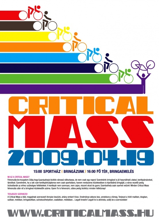 Felvonulás és mozgalom. Célja, hogy Szombathelyt biciklis várossá változtassa, de nem csak egy napra! A közlekedési célú, mindennapos kerékpározás népszerűsítéséért, a várost érő forgalmi terhelés, és szmog csökkenéséért demonstrálnak. A Critical Mass résztvevői szeretnének bringával is jól használható utakat, kerékpársávokat, tárolókat. Szeretnék, ha a sok ezer kerékpár tulajdonos nem csak sportolásra, hanem rendszeres közlekedésre is kipróbálná bringáját, a város vezetői pedig biztosítanák az ehhez szükséges feltételeket. A kerékpár nem szennyez, nem zajos, viszont olcsó és gyors. Szombathely csak nyerhet velük! Minden Critical-felvonulás után nő a bringával közlekedők száma. Tavaly szeptemberben valami elindult Szombathelyen, legyen hát folytatása a dolgoknak.