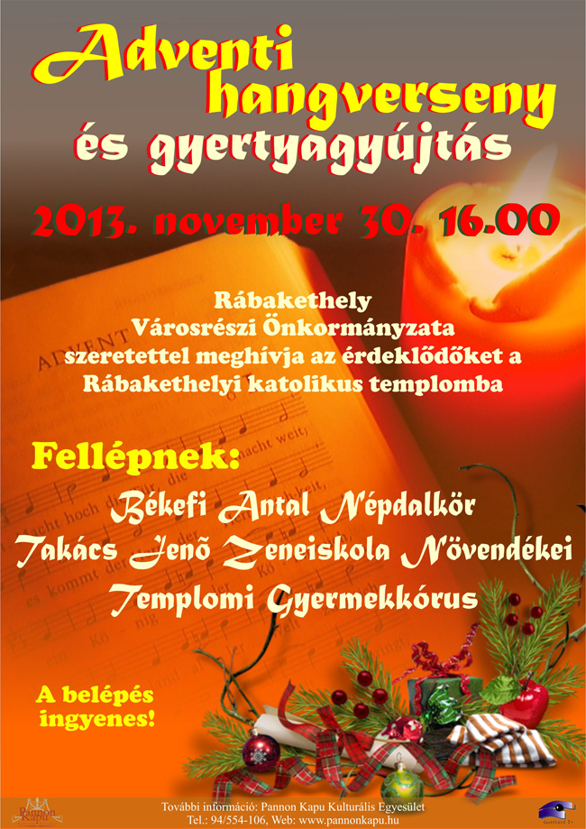 December 1. kb.9:00Az adventi koszorú első gyertyájának meggyújtása a reggeli mise után, kis műsorral.