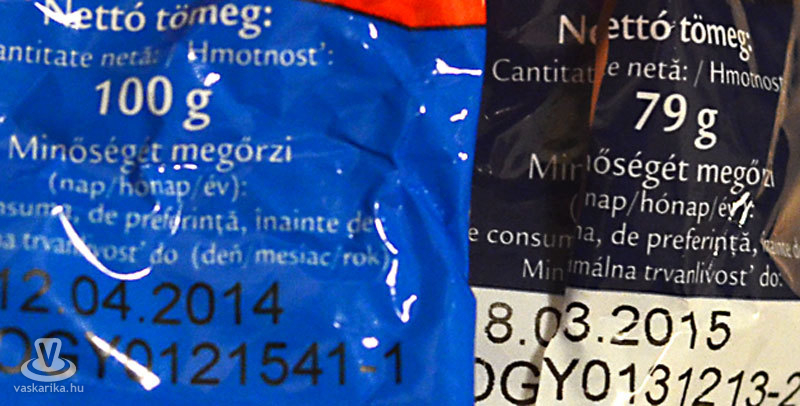 Nemrég megdöbbenésemre kétfajta árcédulát fedeztem fel, két látszólag egyforma külsejű mogyorókrémes üvegen. Egyik ára 699,- a másik 999,- Ft volt?!? Rosszul árazták be? Nem. A megfejtés a csaknem teljesen azonos címke tömegadatában volt, egyikben 350 g, a másikban 400 g krém volt, azaz egyikbe egy jó ujjnyival kevesebbet töltöttek. A marketinges - a lebukásveszély miatt - nem engedte volna azonos polcra rakni a két terméket...