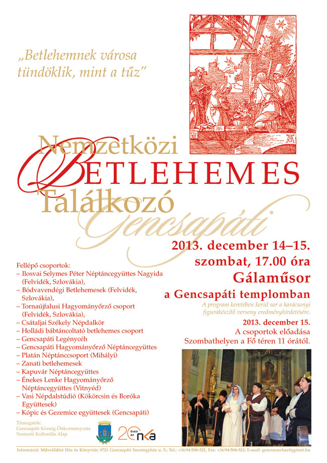 Már tízedik alkalommal kerül megrendezésre a Nemzetközi Betlehemes Találkozó Gencsapátiban. 2013. december 14-én, a találkozó Gálaműsorát tekinthetik meg az érdeklődők a Gencsapáti templomban 17 órai kezdettel, amelyben felvidéki (Nagyida, Tornaújfalu, Bódvavendég), bukovinai székely (Csátalja), somogyi bábtáncoltató betlehemes (Hollád) és a régió hagyományőrző csoportjai (Mihályi Platán Néptánccsoport, Kapuvár Néptáncegyüttes Zanati betlehemesek, Gencsapáti Legénycéh, Gencsapáti hagyományőrző Néptáncegyüttes, Vasi Népdalstúdió, Kópic és Gezemice csoportok) mutatkoznak be. Láthatják az érdeklődők, hogy különböző vidékeken milyen formában maradt meg a szokás. A csoportok nagy örömmel jönnek Gencsapátiba, oda ahol még él a hagyomány, és ők is bemutathassák településük talán legszebb dramatikus szokását.