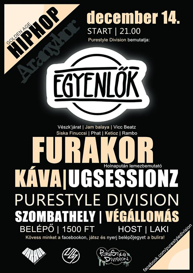 December 14-én, szombaton a régi idők hangulatát felidéző hip-hop fesztivál kerül megrendezésre a Végállomásban. A programban szerepel az Egyenlők és a Furakor lemezbemutatója, valamint a teljes létszámmal megjelenő Káva Krú fellépése. Rajtuk kívül színpadra lép az UGSESSIONZ, valamint a Purestyle Division is, a lemezjátszók mögött pedig Laki válogat szigorúan a 90-es évek hip-hop muzsikáiból.
