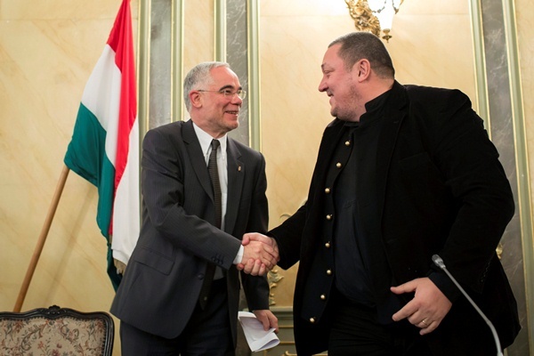 Balog Zoltán gratulál a Nemzeti Színház élére frissen kinevezett Vidnyánszky Attilának - MTI Fotó: Mohai Balázs
