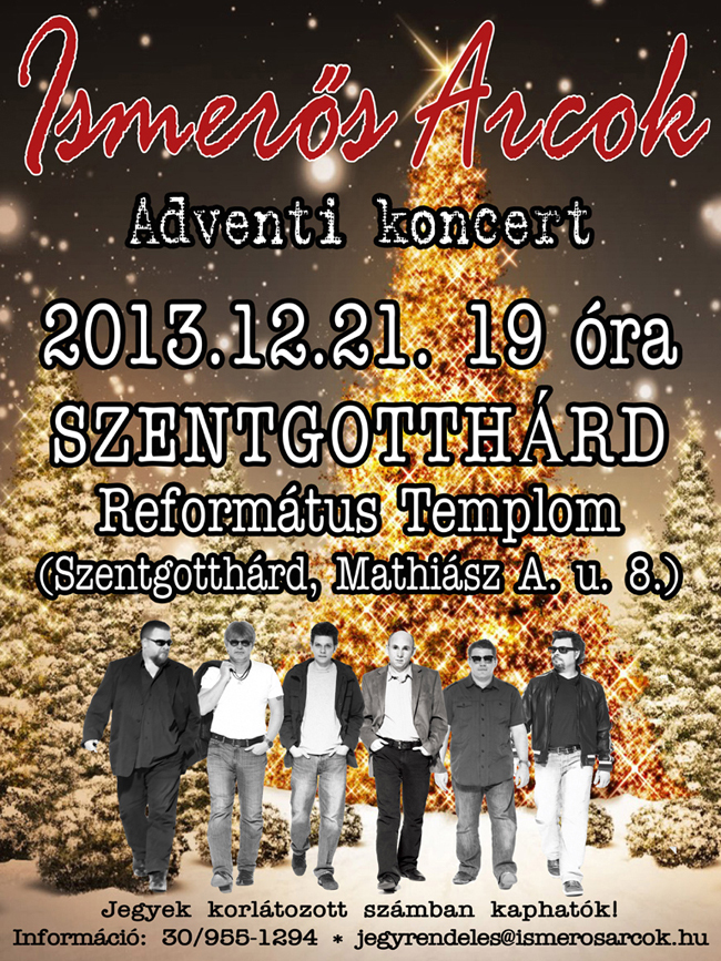 December 21-én szombaton este 19 órától Karácsony előtti utolsó koncertjét tartja az Ismerős Arcok zenekar a szentgotthárdi Református Templomban (Mathiász A.u.8). A rajongók különleges templomi - igazi karácsonyváró - adventi koncertre számíthatnak.