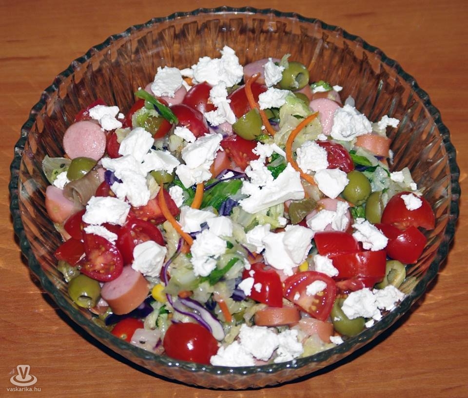Jómagam mindig szívesen készítek salátákat és szeretem ezeket húsfélékkel is gazdagítani. A legjobb ilyen alkalmakra a pulykamell, de a szilveszteri tiltó lista miatt - ugyebár a szárnyas elrepül a szerencsénkkel, így az év utolsó napján nem szerencsés fogyasztani - virslivel készítem ezt a salátát ilyenkor. Összeaprítok paradicsomot, kígyóuborkát, feta vagy krémfehér sajtot (a trappista is jó) egy edénybe olyan arányban, hogy mindenből nagyjából ugyanannyi legyen. Ehhez karikázok virslit, majd az egészet leöntöm natúr joghurttal, és fűszerezem oreganóval. Ez a saláta akkor a legjobb, ha pár órát állni hagyjuk, hiszen az oregano akkor érvényesül igazán. Egy kis majoránnával is gazdagíthatjuk, erősebbé tehetjük az ízhatást. Amennyiben nem szeretjük az uborkát, vegyes zöldségekkel is helyettesíthetjük, pl.: káposzta, sárgarépacsíkok, sőt, ízesíthetjük olívabogyóval is.