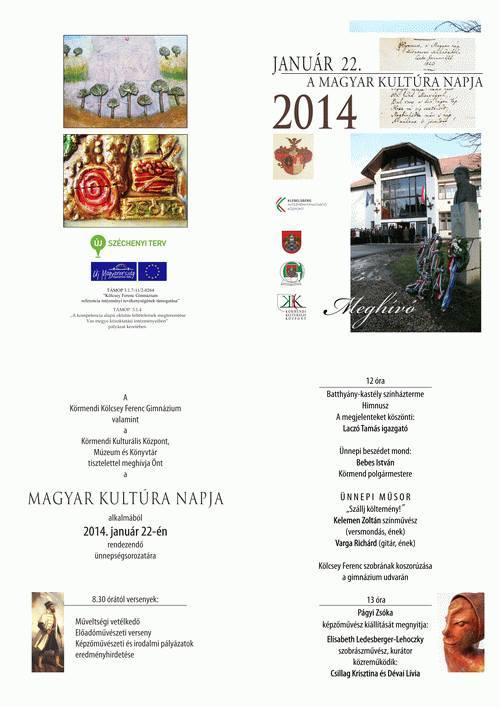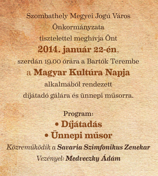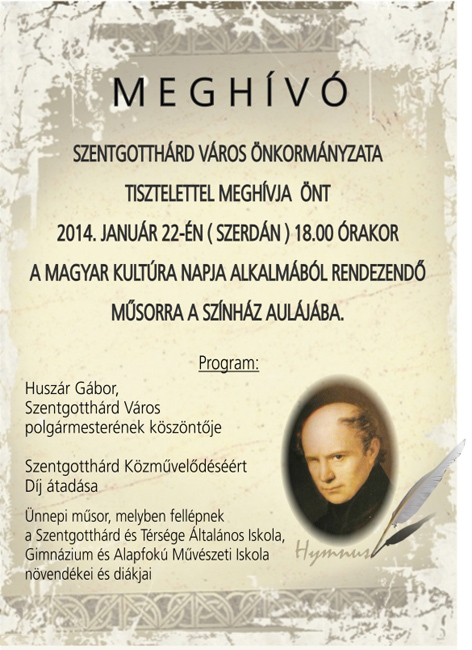 Szentgotthárd Város Önkormányzata 2014. január 22-én ünnepli a Magyar Kultúra Napját. A műsorban közreműködnek a Szentgotthárd és Térsége Általános Iskola, Gimnázium és Alapfokú Művészeti Iskola növendékei és diákjai, valamint sor kerül a Szentgotthárd Közművelődéséért Díj átadására is.
