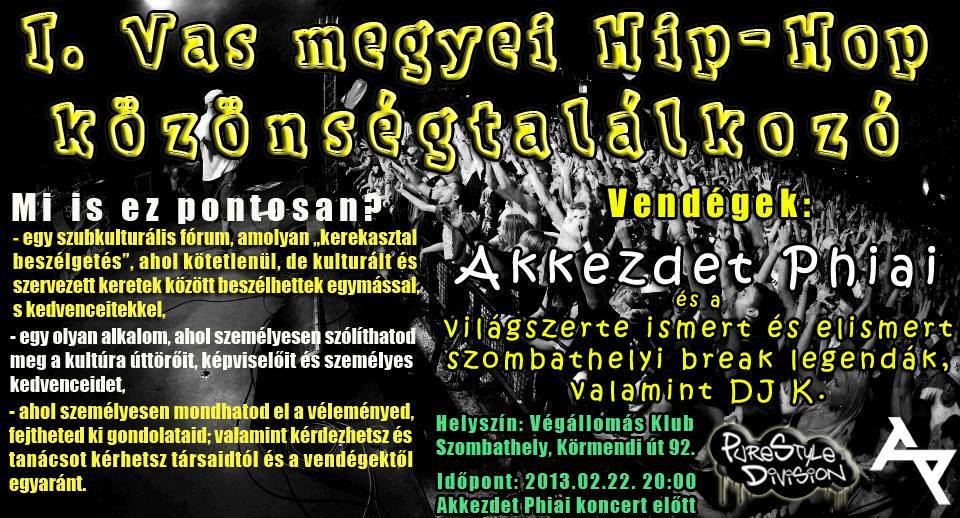 "Manapság rengetegen fogékonyak a hip-hop-ra, de a legtöbben csak egy zenei stílust látnak benne a sok közül. Ezért is tartottuk fontosnak megszervezni ezt a közönségtalálkozót, mert ilyen lehetőség csak kevesek előtt adódik, hogy meghallgathassák Saiidék és az egész világot bejárt breaktáncosok történeteit." Február 22-én a Végállomásban rendezik az 1. Vas megyei Hip-Hop közönségtalálkozót, amit Akkezdet Phiai koncerttel koronáznak meg a szervezők. A hétvégén felkerestük a rendezvényt tető alá hozó Purestyle Division csapatát, hogy megtudjunk egyet s mást erről az eseményről és a 2014. évi terveikről.