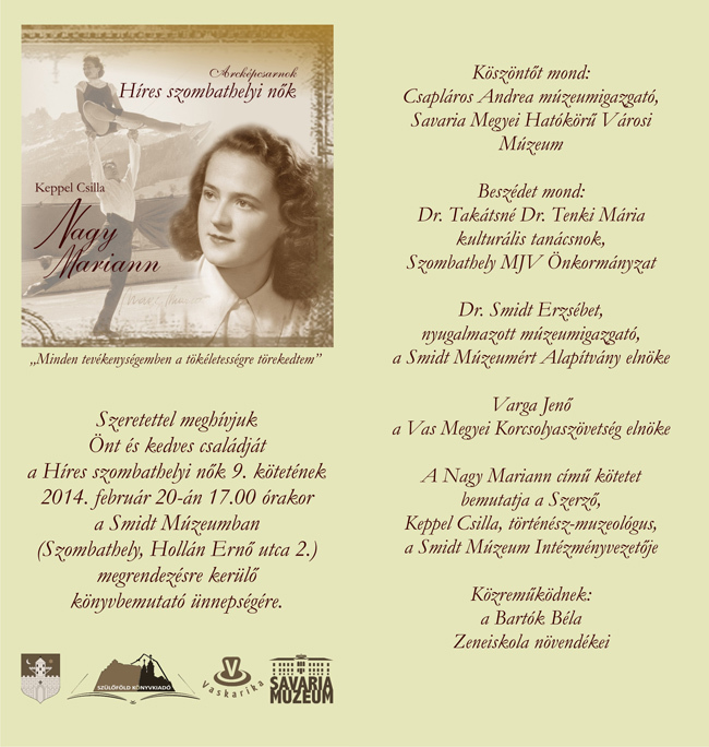"Miért nem volt kinek továbbadni a megszerzett szakismereteiket? A sportszakma 60-as, 70-es éveinek stratégiai döntéseiben a konfliktusokkal terhes magyar valóság is szerepet játszott. Vidékiként nyugodt légkörön nevelkedett, szerény, önmaga előretolásához kevésbé értő mentalitással abban a közegben, ami Budapesten volt, jobbnak látta Nagy Mariann, ha inkább vidékre vonul." A Szülőföld Könyvkiadó Híres szombathelyi nők című könyvsorozatának következő kötete Nagy Mariann életét dolgozza fel. A február 20-án, 17 órakor a Smidt Múzeumban tartandó könyvátadó ünnepségen ismerkedhetünk meg Nagy Mariann életével. Ezzel kapcsolatban Keppel Csillát, a könyv szerzőjét kérdeztük a korcsolyázónőről.