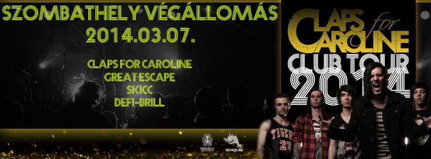 Március 7-én a Végállomás Klubban lép fel a Claps for Caroline. Az electrocore zenét játszó törökszentmiklósi banda 2010-ben alakult, és először láthatja őket a szombathelyi közönség egy országos, nyolc fellépésből álló turné negyedik állomásán. Vendég a Great Escape és a Defi Brill.