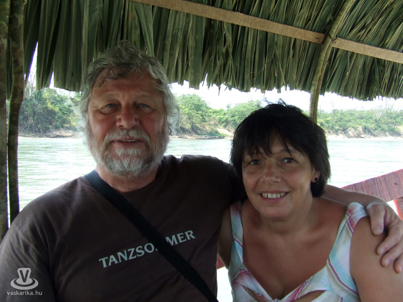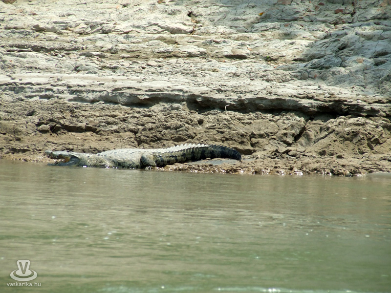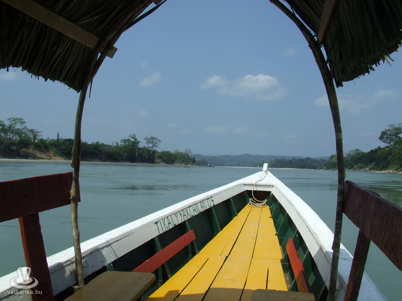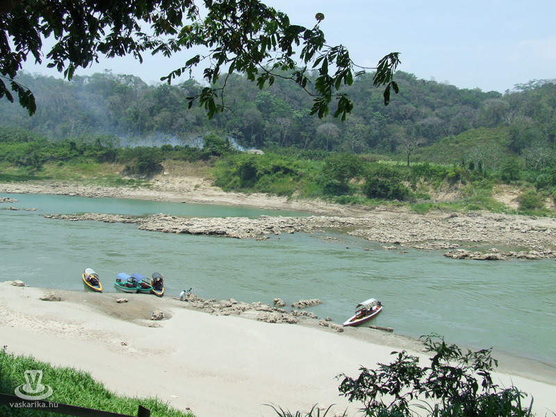 Az Ucumacinta folyó Tisza nagyságú, 100-130 m. széles, de az esős időszakban valóságos folyammá duzzad. A csónakot vezető indián megmutatta, hogy milyen magasságig ér olyankor a víz. A lélekvesztő,- mert másnak nem lehetett nevezni a csónakot- ha örvénybe kerültünk, valósággal beleremegett a víz sodrásába. Mivel nem vagyok egy gyakorlott úszó, folyamatosan arra gondoltam, hogyan fogok kiúszni a partra, ha netán süllyedünk, de férjem megnyugtatott, hogy ilyen gondom ne legyen, a folyó tele van krokodilokkal, nem lesz úszásra szükség. Valóban, a két parton száraz farönkként napoztak a hatalmas állatok, de a folyóban is felbukkant néhánynak a feje. A csónakos viccesen megjegyezte, hogy lehetőleg ne dugjuk a kezünket a vízbe, mert a piranhák miatt nem látjuk azt viszont. A krokodilok jelenléte ellenére a folyó guatemalai oldalán gyermekek fürödtek a sekélyebb vízben, miközben teheneket itattak.