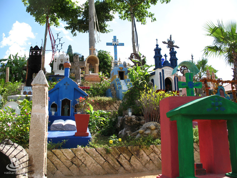 A temetőkben minden családnak van egy takaros kriptája, ami gyönyörűen ki van festve a legelképesztőbb színekre, rózsaszínűre, kékre, zöldre, és természetesen itt is minden tele van virággal és gyertyával. Ezek a ház- kripták olyanok, mint az igazi házak, ablakokkal, csinos csipkés függönnyel, ajtóval. Mintha a majákat az evilági életnél sokkal jobban érdekelné a túlvilág, mert minden, aminek köze van természetfelettihez és a halálhoz, túlcsordul a színektől.