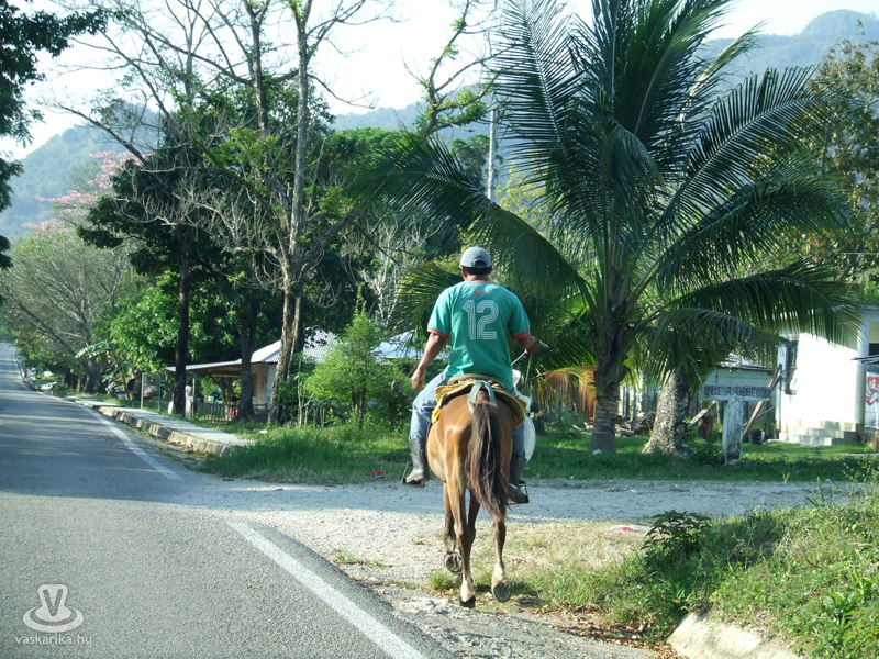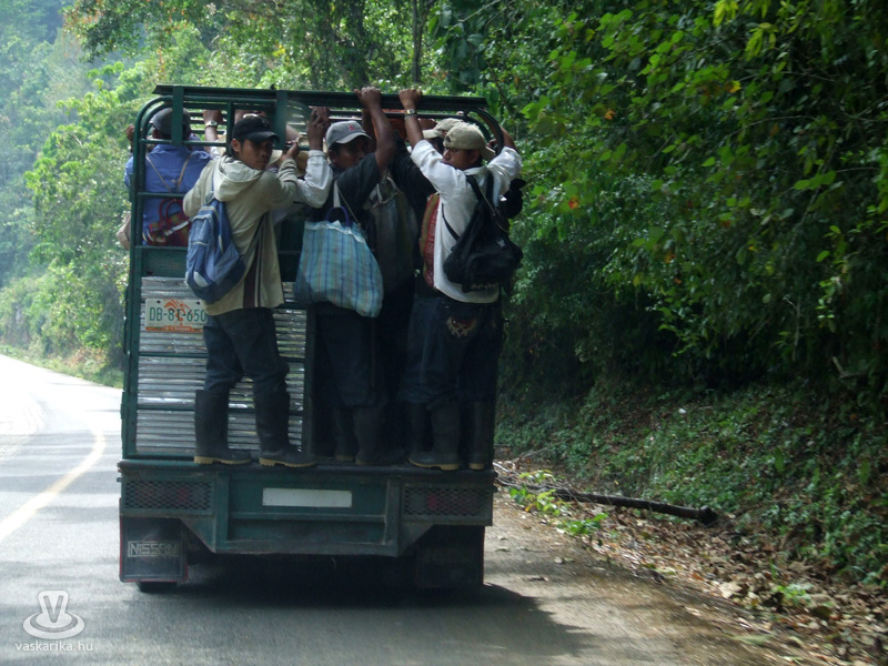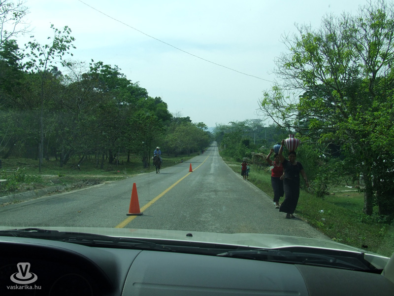 A guatemalai határig vezető út kisebb és nagyobb indián falvacskákon vezetett át. Nagyon figyelmesnek kellett lennünk vezetés közben, mert az út széle tele volt papayát, mangót és kukoricát áruló kisebb és nagyobb gyermekekkel, akik szaladtak a kocsi mellett. Nagyon szegény települések voltak, kis bambusznád kunyhókkal, olykor takarosabb iskolaépületekkel. Utunk során lovasokkal is találkoztunk, akik a ranchre igyekeztek, és asszonyokkal, akik a fejükön, ki tudja milyen messziről, színes korsóban szállították az ivóvizet. A legfurcsábbnak mégis az tűnt, hogy mindegyik indián faluban volt egy vadonatúj aszfaltozott kosárlabdapálya, amely teljesen elütött a környezettől. Egyszerűen nem értettük meg azt, hogy a mexikói államnak miért kosárlabdapályák építésével kell segítenie az amúgy 160 cm-nél nem magasabb maja indiánokon!