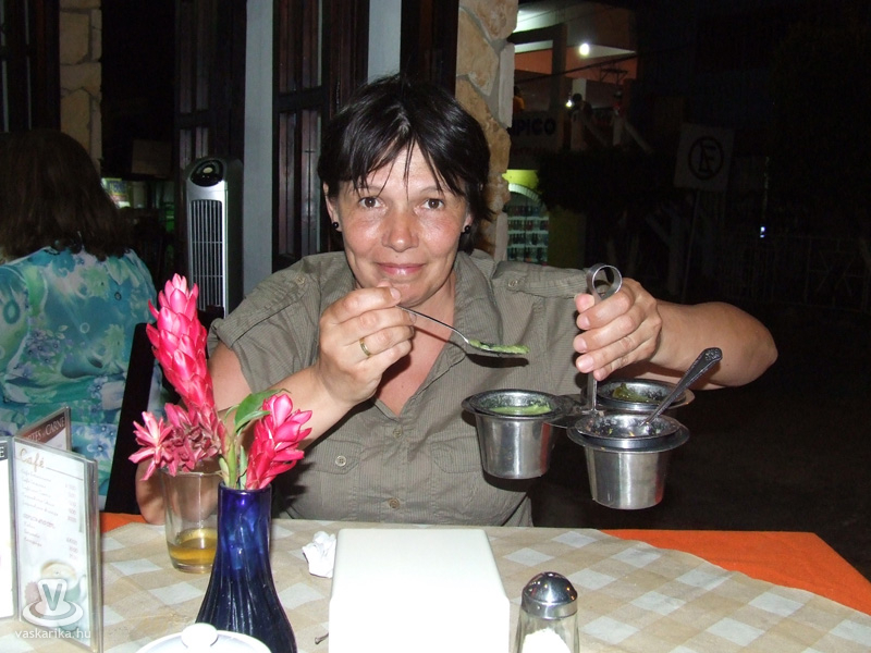 Este a városba mentünk vacsorázni. A fő téren egy színpad volt felállítva, amelyen különböző helybeli együttesek léptek fel, és a színpad előtt gyermekek táncoltak a zenére. Az egyik internetkávézóban sikerült minden aggódó ismerősünknek e-mailt küldeni, hogy megnyugtassuk őket, még megvagyunk. A tér mellett, egy hangulatos étteremben vacsoráztunk, a jelenlevők egy hatalmas kivetítőn a guatemalai focicsapat és egy európai csapat játékát követték, egyhangú, hangos kiáltásokkal biztatva a szomszédos Guatemala játékosait. Az étterem tulajdonosa minden ablakot és ajtót kinyitott, hogy a téren sétáló, gyöngyöket és karkötőket árusító gyermekek és felnőttek is láthassák a meccset.