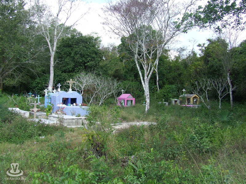 Escarcéga előtt megpillantottunk egy temetőt az út mellett, ami felkeltette a kíváncsiságunkat. Színes házak jelképezték a sírokat, házak, amelyek rikító, élénk színre voltak mázolva. Mintha a házban élne az elhunyt személy.