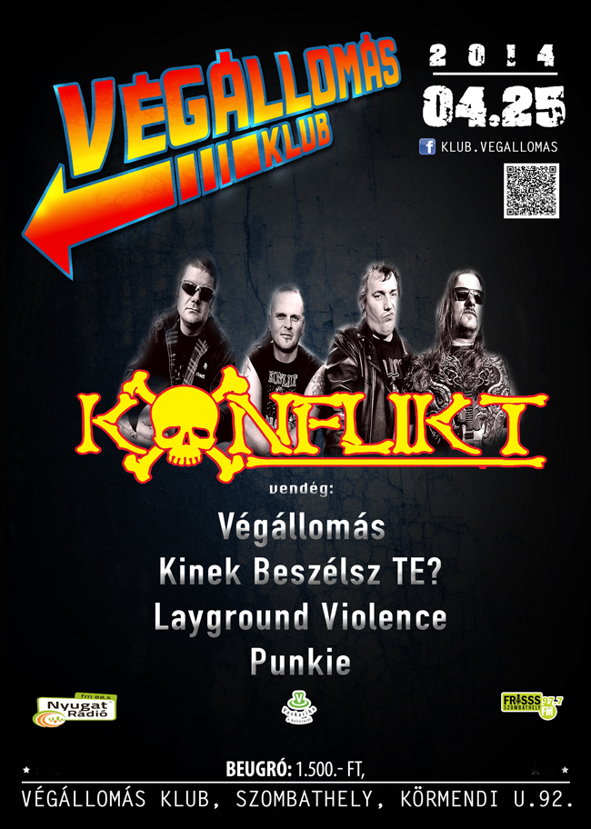 Április 25-én, pénteken a punk zene szerelmesei vehetik birtokukba a Végállomást. Érkezik Szlovákiából az Európa szerte jegyzett Konflikt, velük tart a Layground Violence is. A hazai színeket a várpalotai Végállomás, a budapesti Punkie képviseli, valamint helyi erőként a K.B.T. teszi tiszteletét az eseményen.
