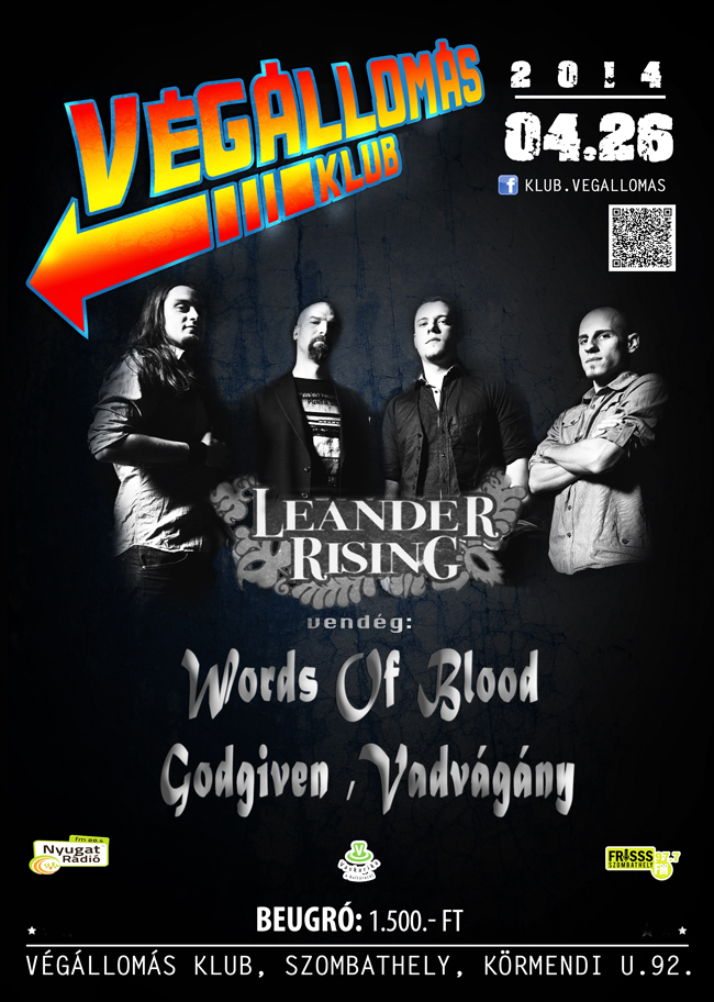 Április 26-án, szombaton a hazai metal színtér üdvöskéje, a Leander Rising veszi birtokba a Körmendi úti deszkákat. Bemelegítésről gondoskodik a helyi reménység Vadvágány, valamint a Godgiven és a Words of Blood.