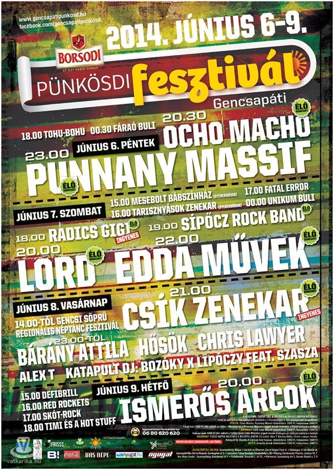 2014-ban 23. alkalommal kerül megrendezésre a négynapos Gencsapáti Pünkösdi Vigasságok összművészeti fesztivál, és annak keretén belül 18. alkalommal a Gencsi Söprű Regionális Néptáncfesztivál. Utóbbin közel félezer táncos lép fel, az est pedig a Csík zenekar koncertjével zárul. A pünkösdi fesztivál könnyűzenei programjában fellép többek közt a Lord, az Ocho Macho, az EDDA, a Punnany Massif és az Ismerős Arcok. A négy nap során 15-20000 látogatót várnak a szervezők.