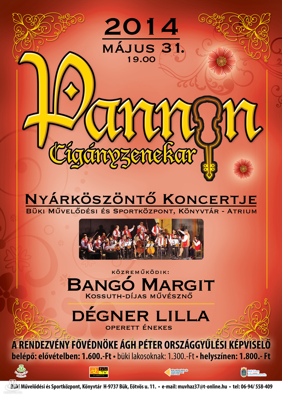 Május 31-én, szombaton 19 órakor a Pannon Cigányzenekar nyárköszöntő nagykoncertjére kerül sor Bükön. A büki Sportcsarnokban ahogy tavaly, úgy várhatóan idén is forró hangulatú koncertet varázsol hallgatói elé a zenekar!