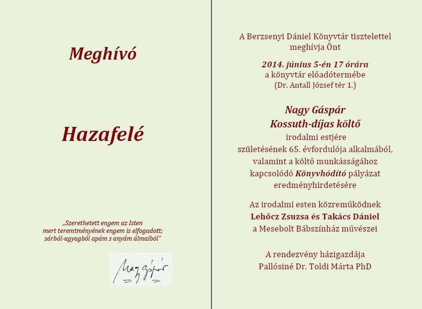 A könyvtár által kiírt Könyvhódító pályázaton Nagy Gáspár irodalmi szellemiségét, gondolatait, verseit lehetett megfilmesíteni, életet powerpointban bemutatni, illetve fiktív facebook profilt létrehozni. A felhívásra több pályamunka érkezett, melynek irodalmi esttel egybekötött eredményhirdetésére június 5-én, csütörtökön 17 órakor kerül sor a Berzsenyi Dániel Könyvtárban.