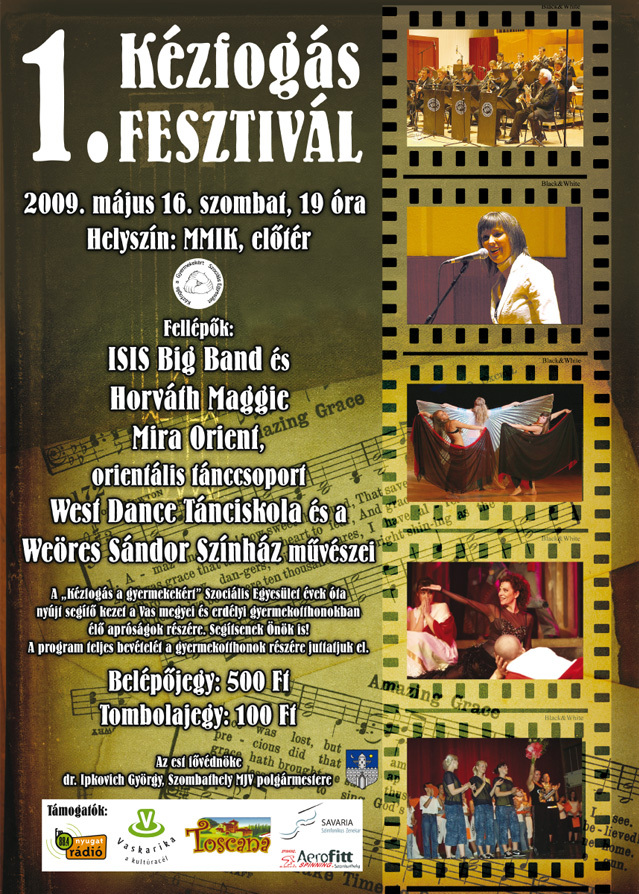 Az Isis Big Band, Horváth Maggie, a Weöres Sándor Színház művészei, a Mira Orient és a West Dance Tánciskola lép fel az 1. Kézfogás Fesztiválon. A „Kézfogás a gyermekekért” Szociális Egyesület évek óta nyújt segítő kezet a Vas megyei és erdélyi gyermekotthonokban élő apróságok részére. 2009. május 16. szombat, 19 órakor az MMIK-ban rendezi meg első fesztiválját, melynek bevételét a gyermekotthonok részére juttatják el.