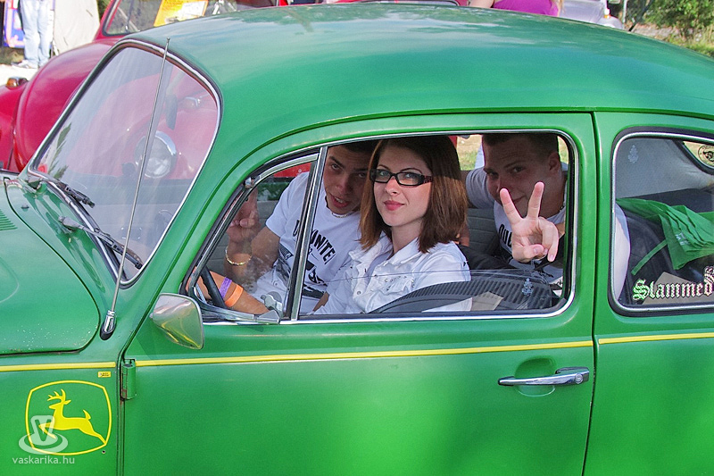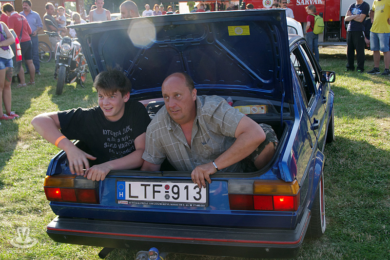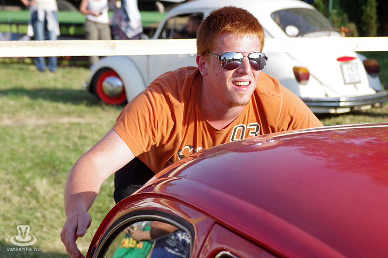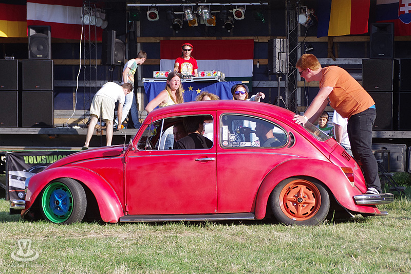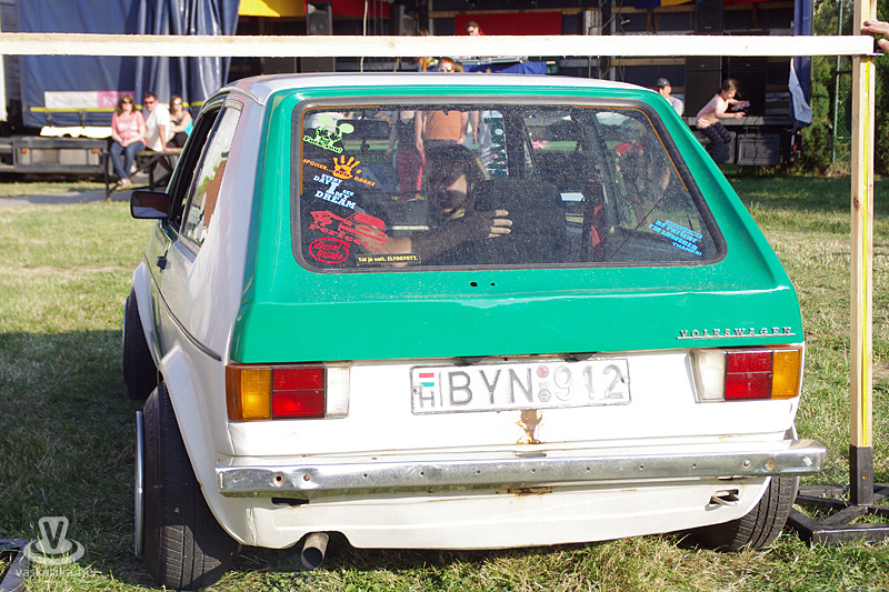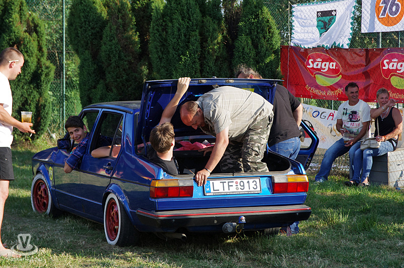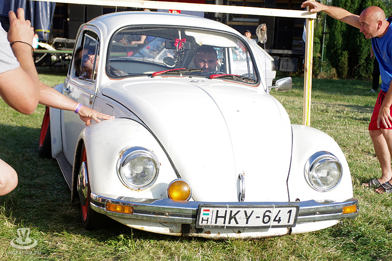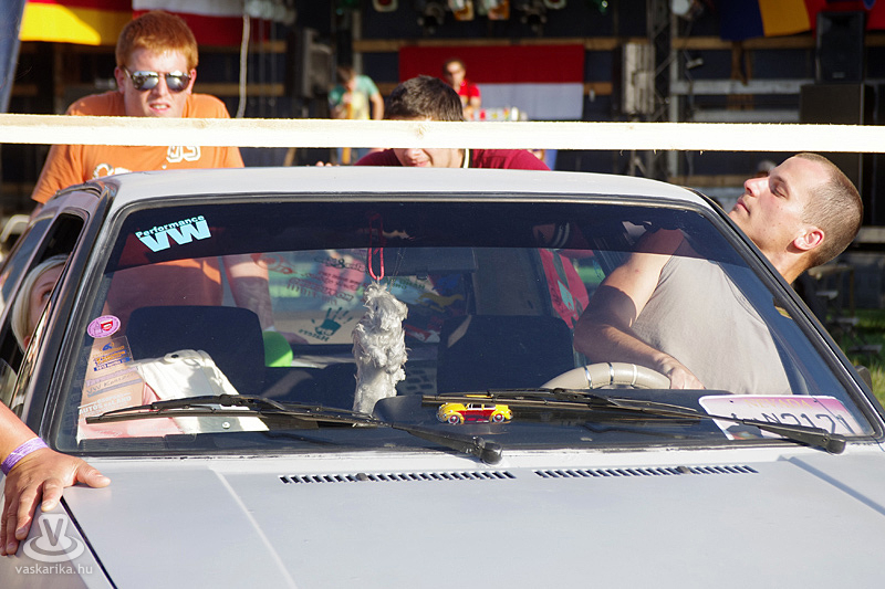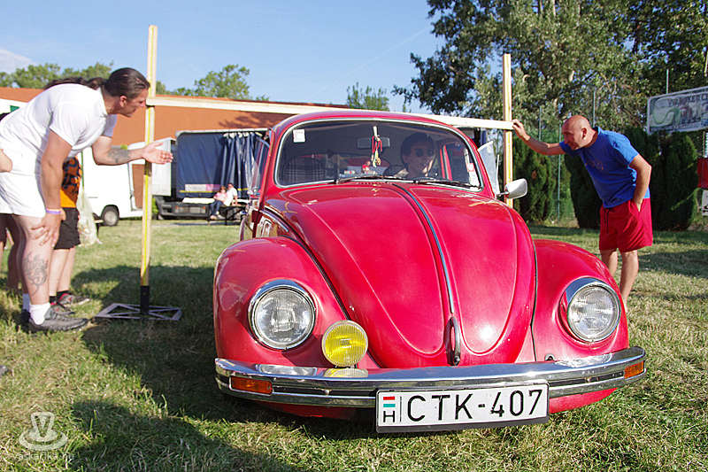 A délután a zenés produkciók és a versenyek jegyében zajlott. Utóbbi a léghűtéses és a vízhűtéses VW-k hangnyomás mérésével indult. Előbbit Szabó Kornél nyerte meg, 123,6-os értékkel. Ezt követte a VW-limbó verseny, melyen különböző praktikákkal próbálták leültetni az autót a versenyzők, hogy az átférjen a léc alatt. A Bogaraknál erre a leghatásosabb a hátsó sárhányóra állás volt, míg egy Jetta csomagtartójába nehezékként 2-3 ember is befért. Nem maradtunk végig, de sejtjük, hogy egy VW Sciroccó a fűre tett limbóléc alatt is átfért volna....