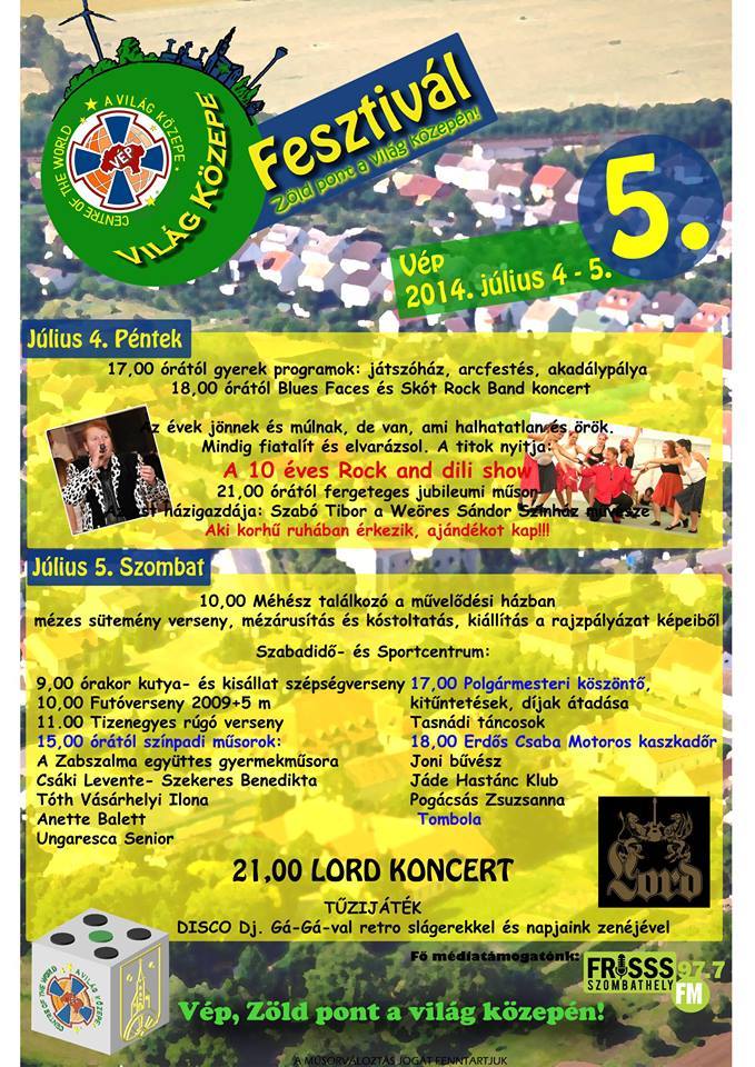 Július 4-én és 5-én az 5. Világ Közepe Fesztiválra várják az érdeklődőket Vépen. Vépet a krónikák szerint 1393-ban WEB néven említik. A világot átfogó információs hálózat neve WEB. Ebből is logikusan következik: VÉP a VILÁG KÖZEPE! Részletes program a plakáton!