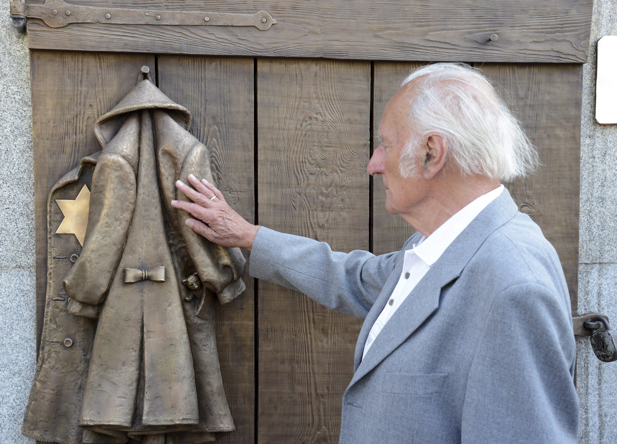 Egy férfi megérinti a Gettó-kapu emlékművet, amelyet a holokauszt 70. évfordulója alkalmából avattak fel Szombathely belvárosában 2014. július 6-án. A köztéri műalkotás az egykori szombathelyi gettó bejáratát jelöli, egy kisgyermek ajtóra akasztott kabátját ábrázolja, a zsebből egy játékmackó feje kandikál ki, bal oldalán pedig hatágú sárga csillag látható. MTI Fotó: Kászoni László