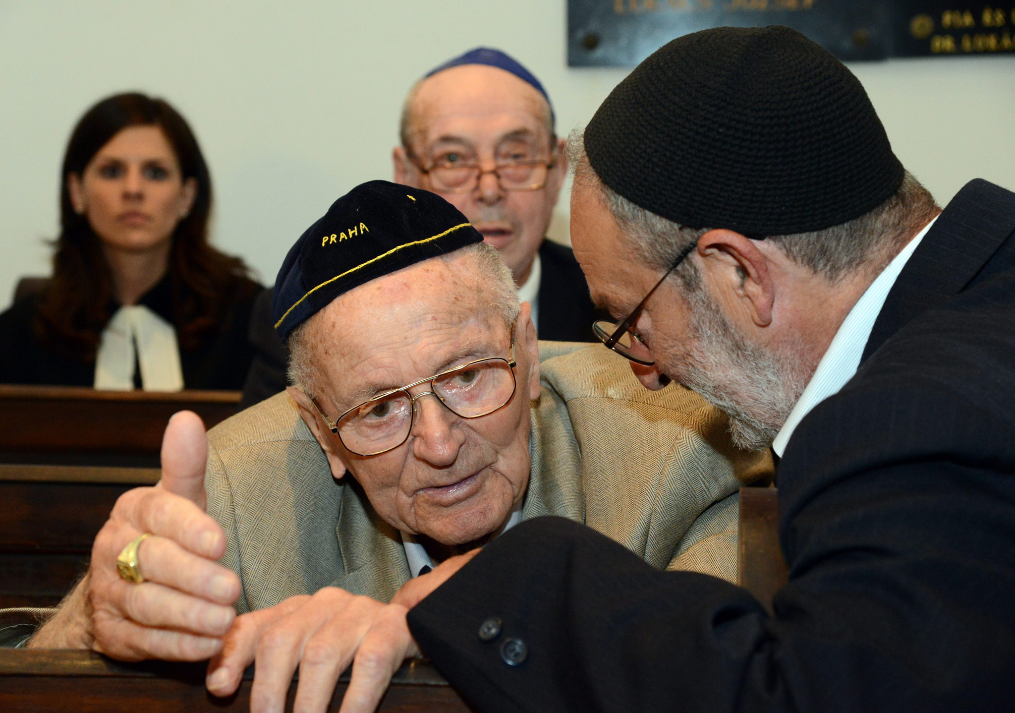 A 101 éves Spiegler Elemér, a legidősebb szombathelyi holokauszttúlélő (j2) a holokauszt 70. évfordulóján tartott megemlékezésen, Szombathelyen, a zsidó hitközség imaházában 2014. július 6-án. Az évfordulón a városháza szomszédságában felavatták a Gettó-kapu emlékművet. MTI Fotó: Kászoni László